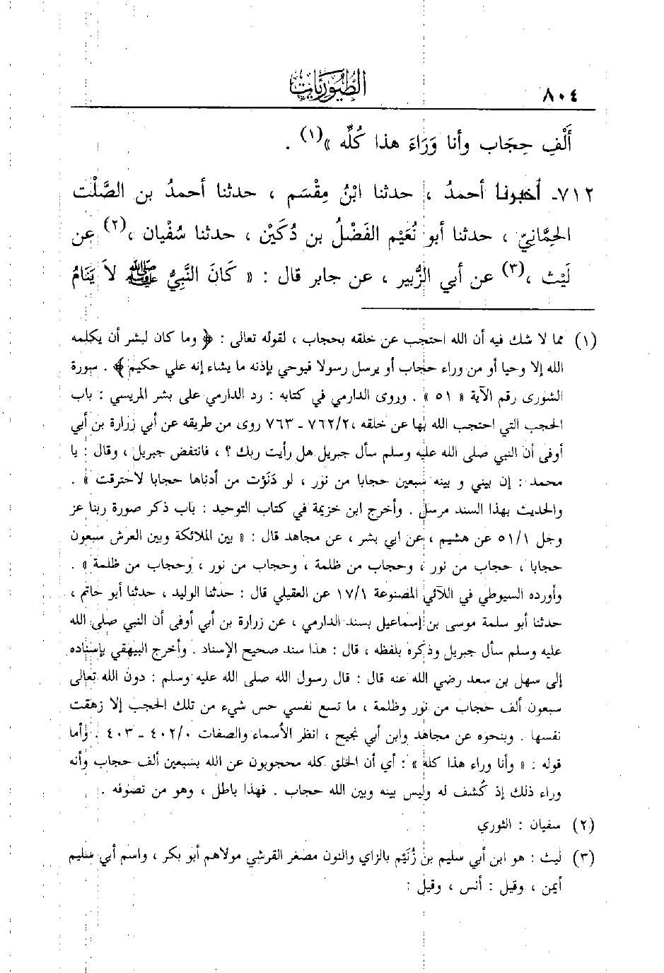 (¬1) مما لا شك فيه أن الله احتجب عن خلقه بحجاب، لقوله تعالى: {وما كان لبشر أن يكلمه الله إلا وحيا أو من وراء حجاب أو يرسل رسولا فيوحي بإذنه ما يشاء إنه علي حكيم} . سورة الشورى رقم الآية ((51)) .