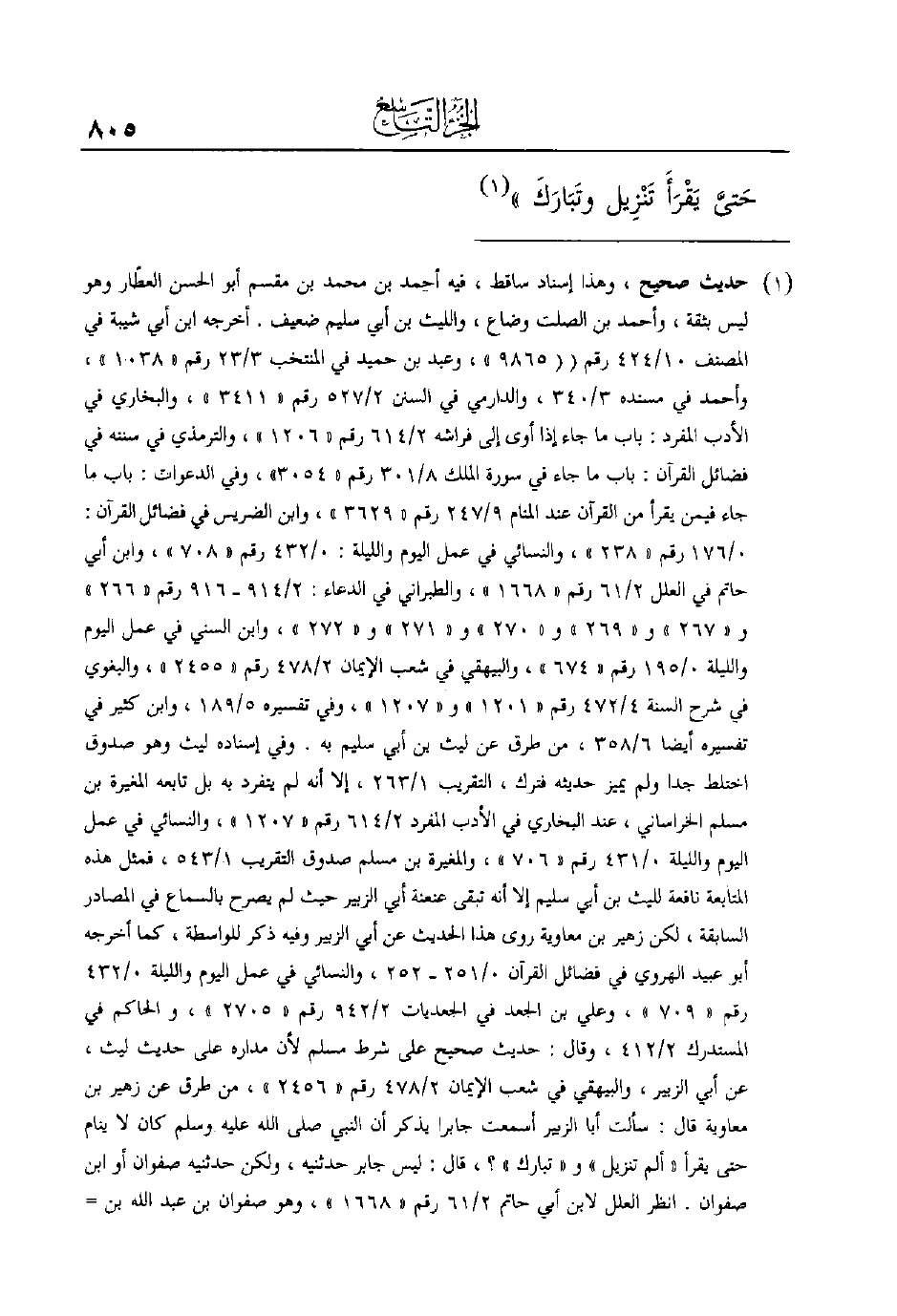 وفي إسناده ليث وهو صدوق اختلط جدا ولم يميز حديثه فترك، التقريب 1/263، إلا أنه لم يتفرد به بل تابعه المغيرة بن مسلم الخراساني، عند البخاري في الأدب المفرد 2/614 رقم ((1207)) ، والنسائي في عمل اليوم والليلة 0/431 رقم ((706)) ، والمغيرة بن مسلم صدوق التقريب 1/543، فمثل هذه المتابعة نافعة لليث بن أبي سليم إلا أنه تبقى عنعنة أبي الزبير حيث لم يصرح بالسماع في المصادر السابقة، لكن زهير بن معاوية روى هذا الحديث عن أبي الزبير وفيه ذكر للواسطة، كما أخرجه أبو عبيد الهروي في فضائل القرآن 0/251- 252، والنسائي في عمل اليوم والليلة