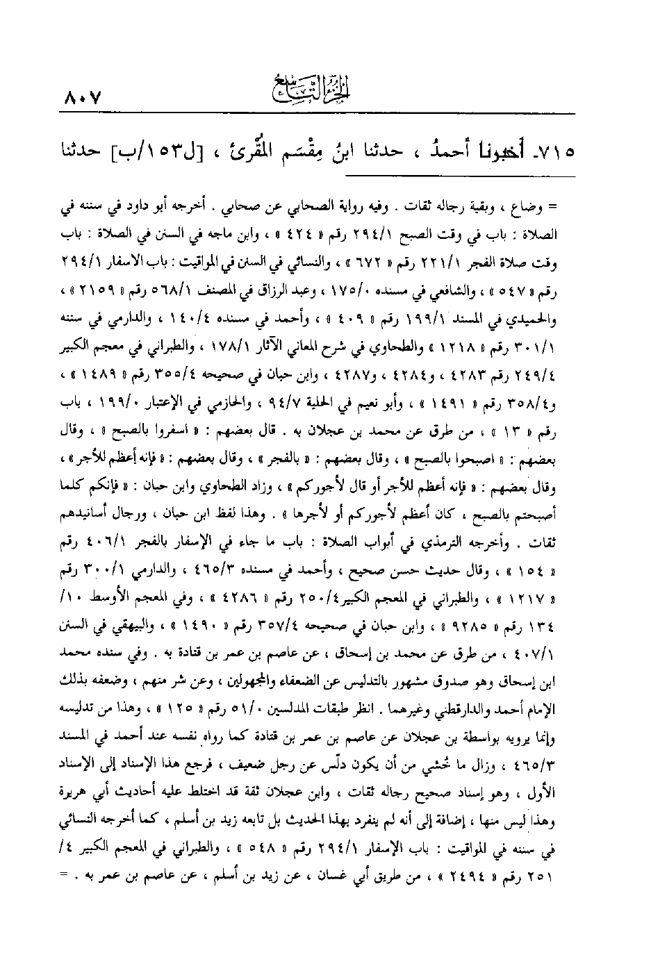 715 - أَخْبَرَنَا أحمدُ، حَدَّثَنَا ابنُ مِقْسَم المُقْرئ، [ل153/ب] حَدَّثَنَا