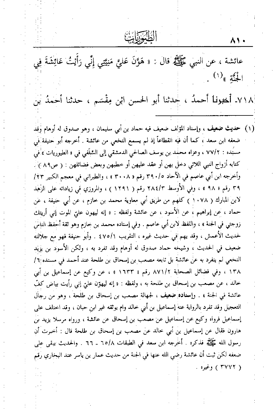 أخرجه أبو حنيفة في مسنده: 2/77، وعزاه محمد بن يوسف الصالحي الدمشقي إلى السِّلَفي في "الطيوريات" في كتابه أزواج النبي اللاتي دخل بهن أو عقد عليهن أو خطبهن وبعض فضائلهن: (ص89) .