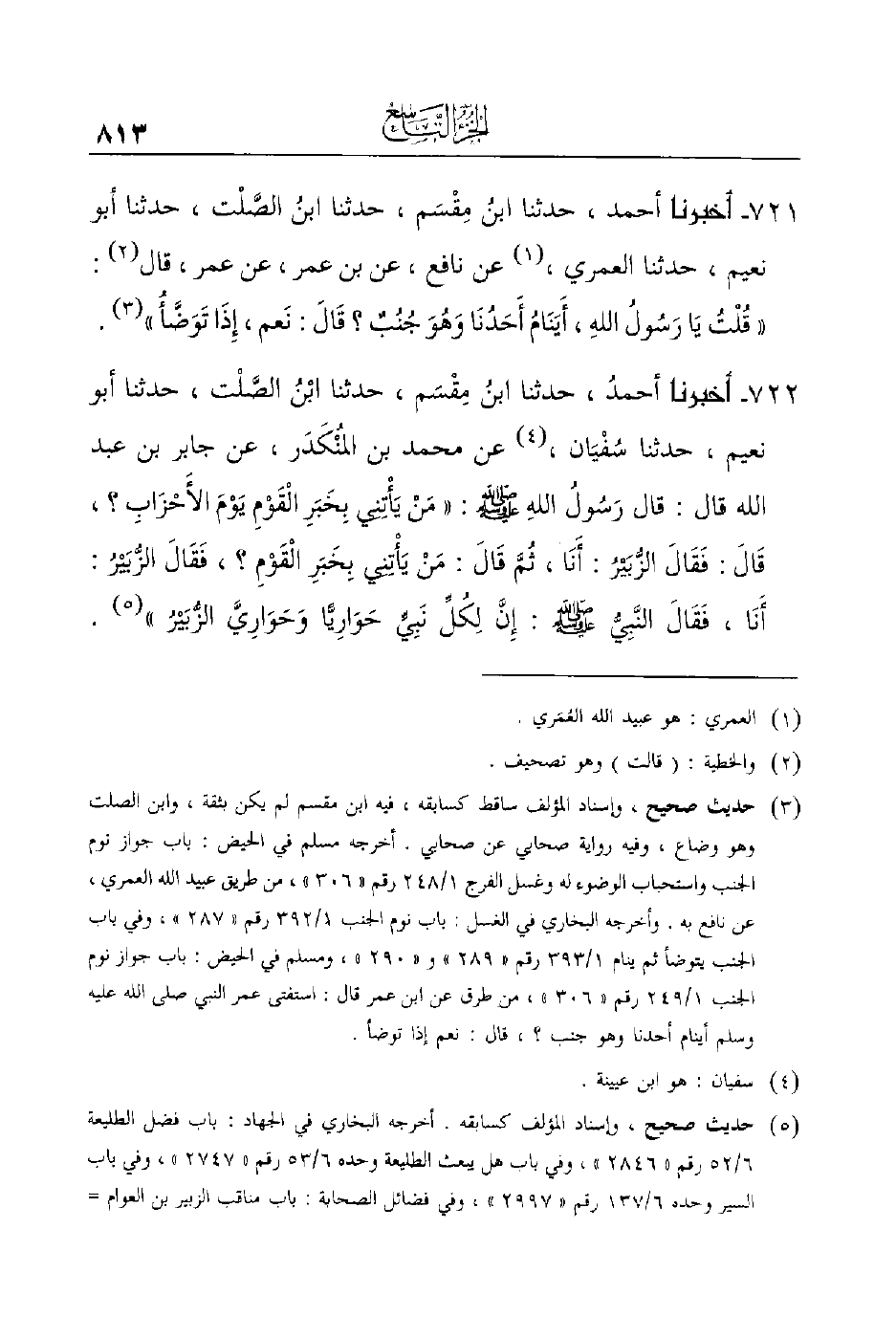 721- أَخْبَرَنَا أَحْمَدُ، حَدَّثَنَا ابنُ مِقْسَم، حَدَّثَنَا ابنُ الصَّلْت، حَدَّثَنَا أَبُو نُعَيْمٍ، حَدَّثَنَا الْعُمَرِيُّ، (¬1) عَنْ نَافِعٍ، عن بن عُمَرَ، عَنْ عُمَرَ، قَالَ (¬2) : ((قُلْتُ يَا رَسُولُ اللهِ، أَيَنَامُ أَحَدُنَا وَهُوَ جُنُبٌ؟ قَالَ: نَعم، إِذَا تَوَضَّأُ)) (¬3) .