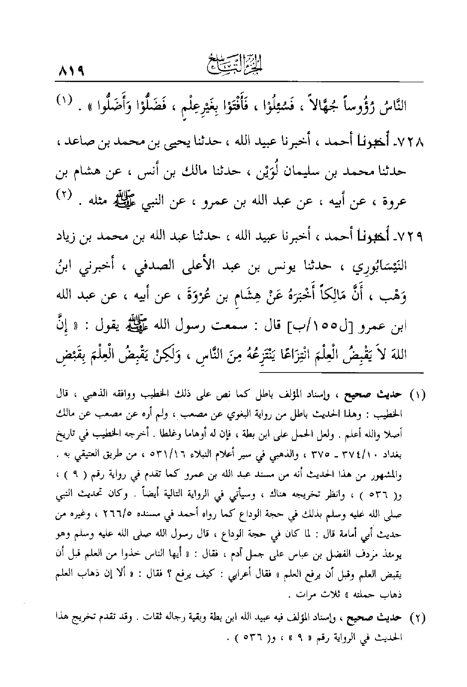 729- أَخْبَرَنَا أَحْمَدُ، أَخْبَرَنَا عُبَيْدُ اللَّهِ، حَدَّثَنَا عبد الله بن محمد بن زياد النَيْسَابُورِي، حدثنا يونس بْنُ عَبْدِ الأَعْلَى الصَّدَفِيُّ، أَخْبَرَنِي ابنُ وَهْب، أَنَّ مَالِكاً أَخْبَرَهُ عَنْ هِشَامِ ابن عُرْوَةَ، عَنْ أَبِيهِ، عَنْ عَبْدِ الله بن عمرو [ل155/ب] قَالَ: سَمِعْتُ رَسُولَ اللَّهِ صَلَّى اللَّهُ عَلَيْهِ وَسَلَّمَ يَقُولُ: ((إِنَّ اللهَ لاَ يَقْبِضُ الْعِلْمَ انْتِزَاعًا يَنْتَزِعُهُ مِنَ النَّاسِ، وَلَكِنْ يَقْبِضُ الْعِلْمَ بِقَيْضِ