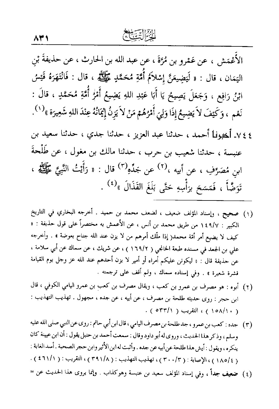 (¬4) ضعيف جداً، وفي إسناد المؤلف سعيد بن عنبسة وهوكذاب. وإنما يروى هذا الحديث عن ليث بن أبي سليم، عن طلحة بن مصرف، وليس مَالِكُ بْنُ مِغْوَلٍ عَنْ طَلْحَةَ.