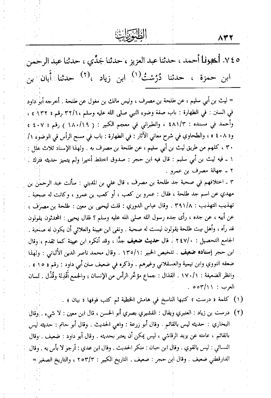 745 - أَخْبَرَنَا أَحْمَدُ، حَدَّثَنَا عَبْدُ الْعَزِيزِ، حَدَّثَنَا جَدِّي، حَدَّثَنَا عَبْدُ الرَّحْمَنِ بن حمزة، حدثنا دُرُسْتُ (¬1) ابن زياد، (¬2) حدثنا أَبان بن