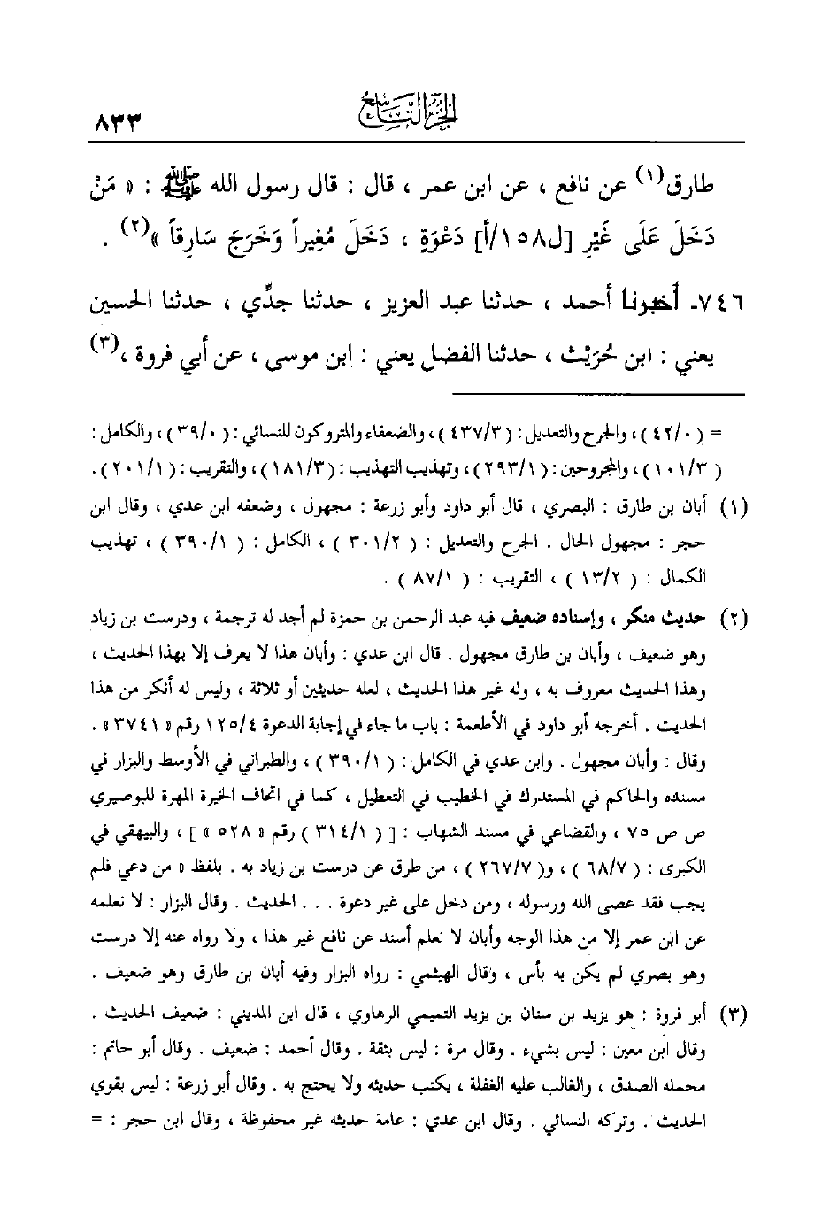 746 - أَخْبَرَنَا أَحْمَدُ، حَدَّثَنَا عَبْدُ الْعَزِيزِ، حَدَّثَنَا جدِّي، حَدَّثَنَا الْحُسَيْنُ يَعْنِي: ابْنَ حُرَيْث، حَدَّثَنَا الْفَضْلُ يَعْنِي: ابْنَ مُوسَى، عَنْ أَبِي فَرْوَةَ، (¬3)