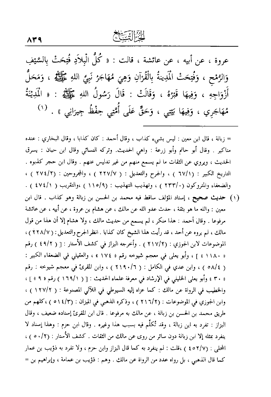 عُرْوَةَ، عَنْ أَبِيهِ، عَنْ عَائِشَةَ، قَالَتْ: ((كُلُّ الْبِلاَدِ فُتِحَتْ بِالسَّيْفِ وَالرُّمْحِ، وَفُتِحَتْ الْمَدِينةُ بِالْقُرْآنِ وَهِيَ مُهَاجَرُ نَبِيِّ اللهِ - صَلَّى اللَّهُ عَلَيْهِ وَسَلَّمَ -، وَمَحَلُّ أَزْوَاجِهِ، وَفِيهَا قَبْرُهُ، وَقَالَتْ: قَالَ رَسُولُ اللهِ - صَلَّى اللَّهُ عَلَيْهِ وَسَلَّمَ -: ((الْمَدِيْنَةُ مُهَاجَرِي، وَفِيهَا بَيْتِي، وَحَقٌّ عَلَى أُمَّتِي حِفْظُ جِيرَانِي)) . (¬1)