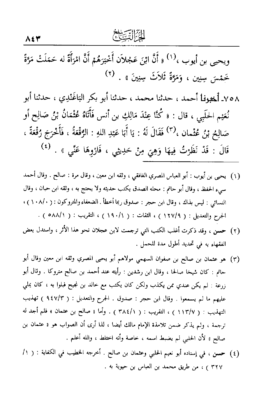 758- أَخْبَرَنَا أَحْمَدُ، حَدَّثَنَا مُحَمَّدٌ، حَدَّثَنَا أَبُو بَكْرٍ البَاغَنْدِي، حَدَّثَنَا أَبُو نُعَيْم الحَلَبِي، قال: ((كُنَّا عِنْدَ مَالِكِ بن أنس فَأَتَاهُ عُثْمَانُ بْنُ صَالِح أو صَالِحُ ابْنُ عُثْمان، (¬3) فَقَالَ لَهُ: يَا