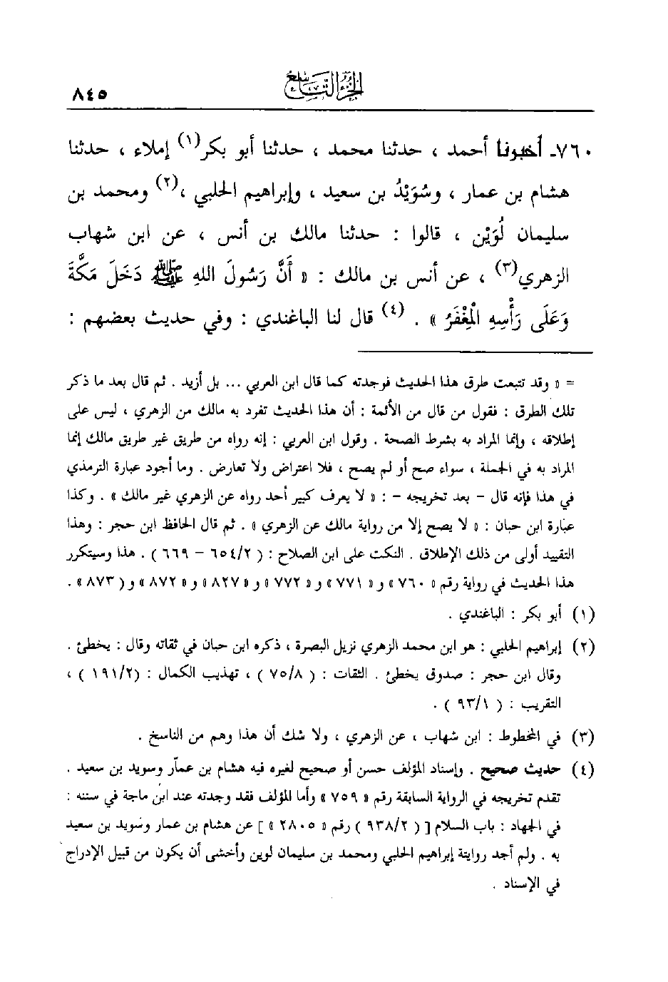 760- أَخْبَرَنَا أَحْمَدُ، حَدَّثَنَا مُحَمَّدٌ، حَدَّثَنَا أَبُو بَكْرٍ (¬1) إِمْلاءً، حَدَّثَنَا هِشَامُ بْنُ عَمَّارٍ، وسُوَيْدُ بْنُ سَعِيدٍ، وَإِبْرَاهِيمُ الْحَلَبِيُّ، (¬2) وَمُحَمَّدُ بْنُ سُلَيْمَانَ لُوَيْن، قَالُوا: حَدَّثَنَا مَالِكُ بْنُ أَنَسٍ، عَنْ ابْنِ شِهَابٍ الزُّهْرِيِّ (¬3) ، عَنْ أَنَسِ بْنِ مَالِكٍ: ((أَنَّ رَسُولَ اللهِ - صَلَّى اللَّهُ عَلَيْهِ وَسَلَّمَ - دَخَلَ مَكَّةَ وَعَلَى رَأْسِهِ الْمِغْفَرُ)) . (¬4)
