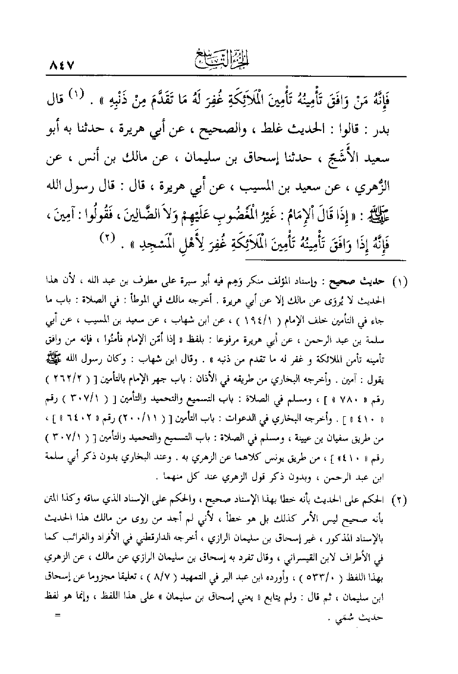 أَبِي هُرَيْرَةَ، قَالَ: قَالَ رَسُولُ اللَّهِ - صَلَّى اللَّهُ عَلَيْهِ وَسَلَّمَ: ((إِذَا قَالَ اْلإِمَامُ: غَيْرُ الْمَغْضُوبِ عَلَيْهِمْ وَلاَ الضَّالِينَ، فَقُولُوا: آمِينَ، فَإِنَّهُ إِذَا وَافَقَ تَأْمِينُهُ تَأْمِينَ الْمَلاَئِكَةِ غُفِرَ لِأَهْلِ الْمَسْجِدِ)) . (¬3)