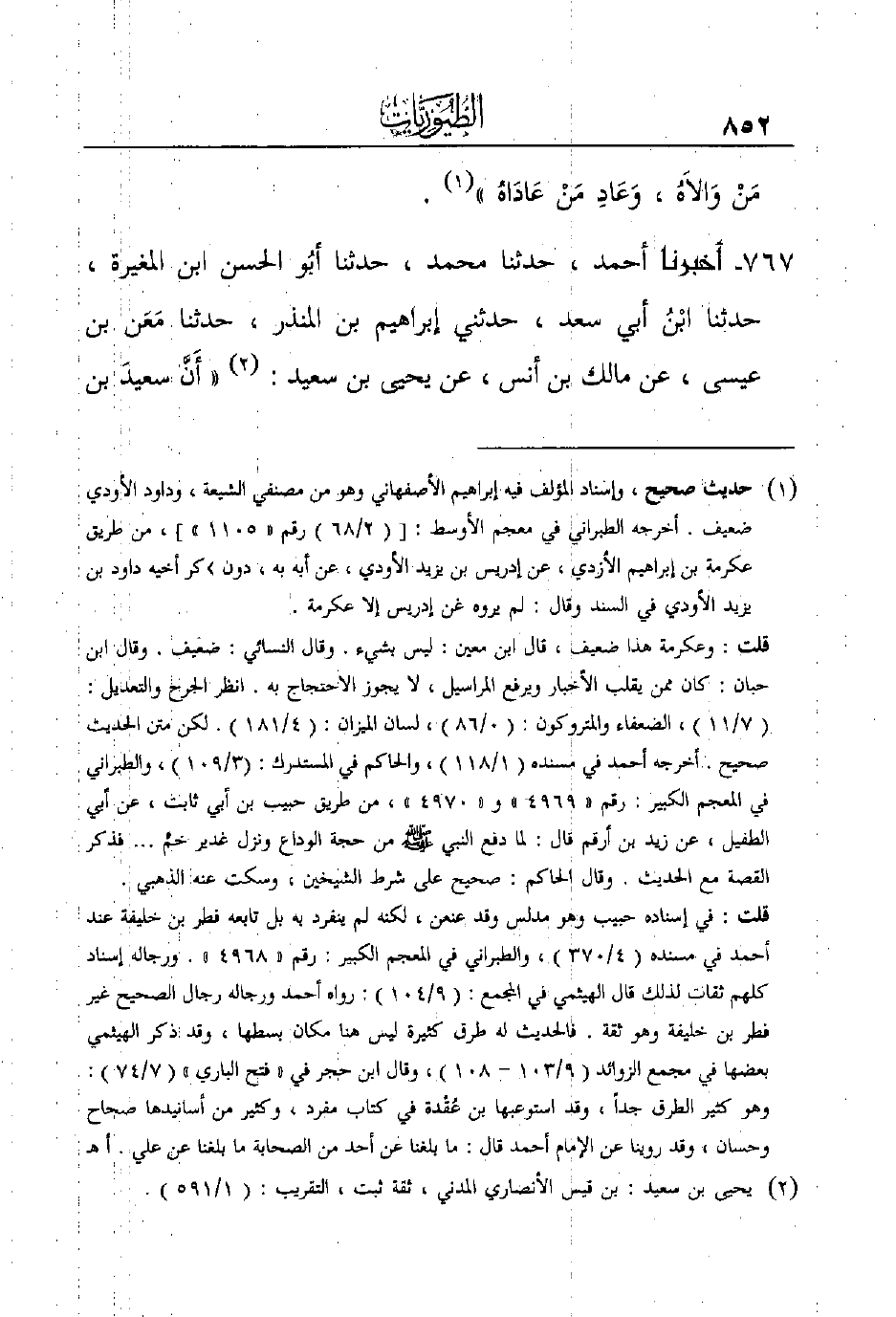 أخرجه أحمد في مسنده 1/118، والحاكم في المستدرك: 3/109، والطبراني في المعجم الكبير: رقم ((4969)) و ((4970)) ، من طريق حبيب بن أبي ثابت، عن أبي الطفيل، عن زيد بن أرقم قال: لما دفع النَّبِيَّ - صَلَّى اللَّهُ عَلَيْهِ وَسَلَّمَ - من حجة الوداع ونزل غدير خمٍّ ... فذكر القصة مع الحديث.