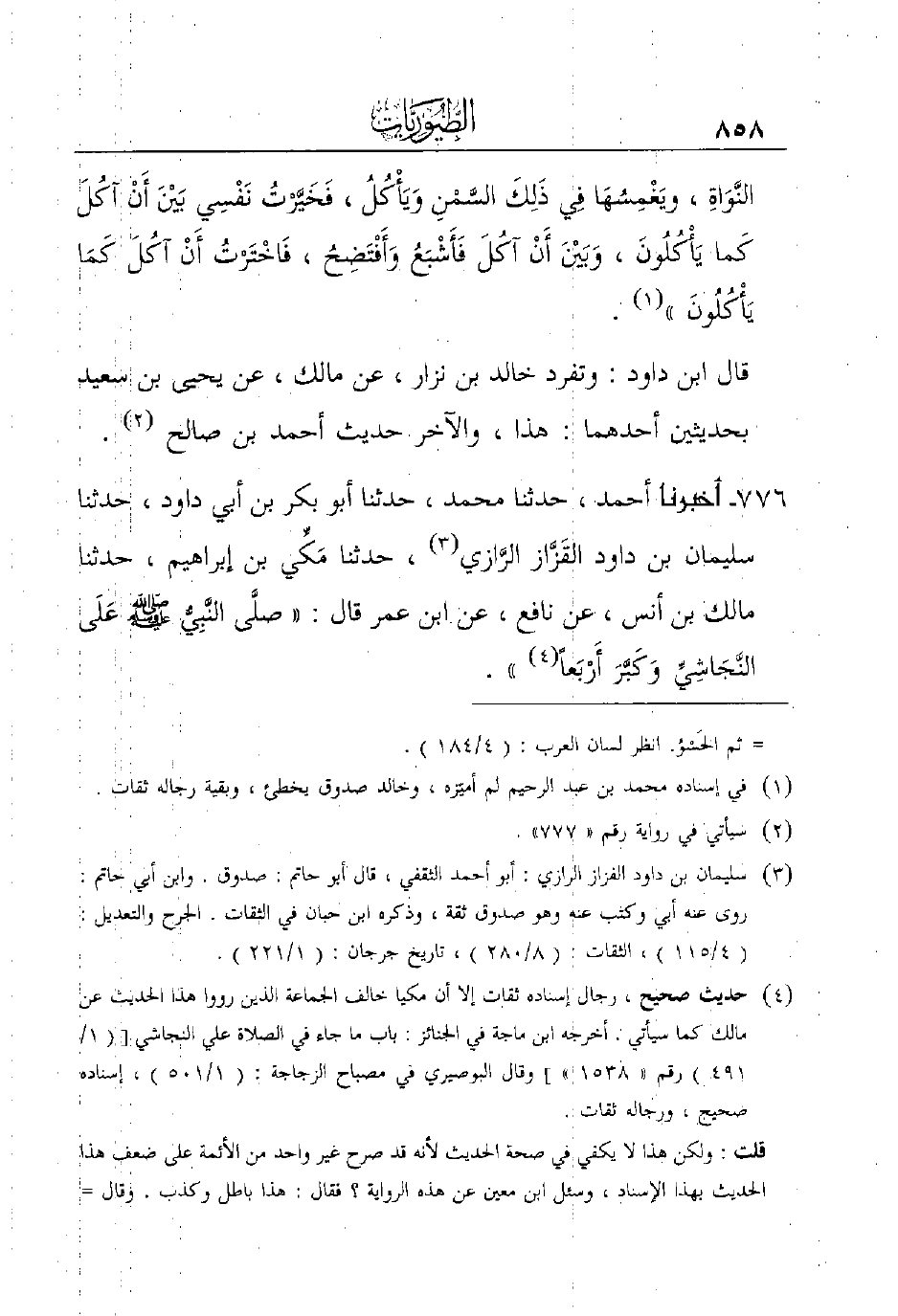 قلت ولكن هذا لا يكفي في صحة الحديث لأنه قد صرح غير واحد من الأئمة على ضعف هذا الحديث بهذا الإسناد، وسئل ابن معين عن هذه الرواية؟ فقال: هذا باطل وكذب. وقال عبد الصمد بن الفضل: سألنا مكي بن إبراهيم عن حَدِيثِ مَالِكٍ، عَنْ نَافِعٍ، عَنِ ابن عمر أن البي صلى الله عليه وسلم كبر على النجاشي أربعا، فحدثنا من كتابه عن مَالِكٌ، عَنِ الزُّهْرِيِّ، عَنْ سَعِيدٍ بْنِ الْمُسَيِّبِ، عَنْ أَبِي هُرَيْرَةَ، وقال هكذا في كتابي. تاريخ بغداد 13/115، وتهذيب الكمال: 28/ 476، وتهذيب التهذيب: 10/260.