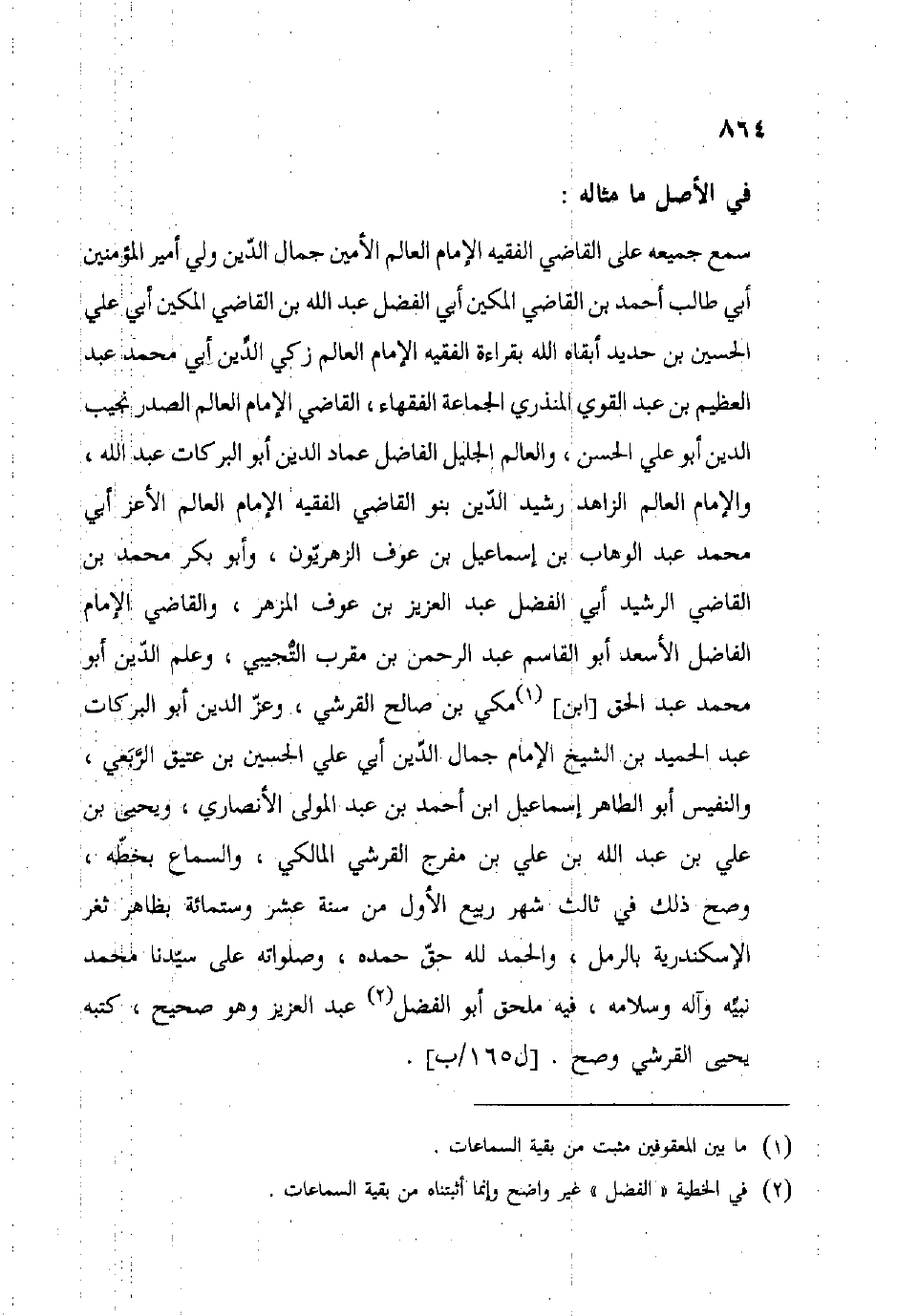 سمع جميعه على القاضي الفقيه الإمام العالم الأمين جمال الدّين ولي أمير المؤمنين أبي طالب أحمد ابن القاضي المكين أبي الفضل عبد الله بن القاضي المكين أبي علي الحسين بن حديد أبقاه الله بقراءة الفقيه الإمام العالم زكي الدِّين أبي محمد عبد العظيم بن عبد القوي المنذري الجماعة الفقهاء، القاضي الإمام العالم الصدر نجيب الدين أبو علي الحسن، والعالم الجليل الفاضل