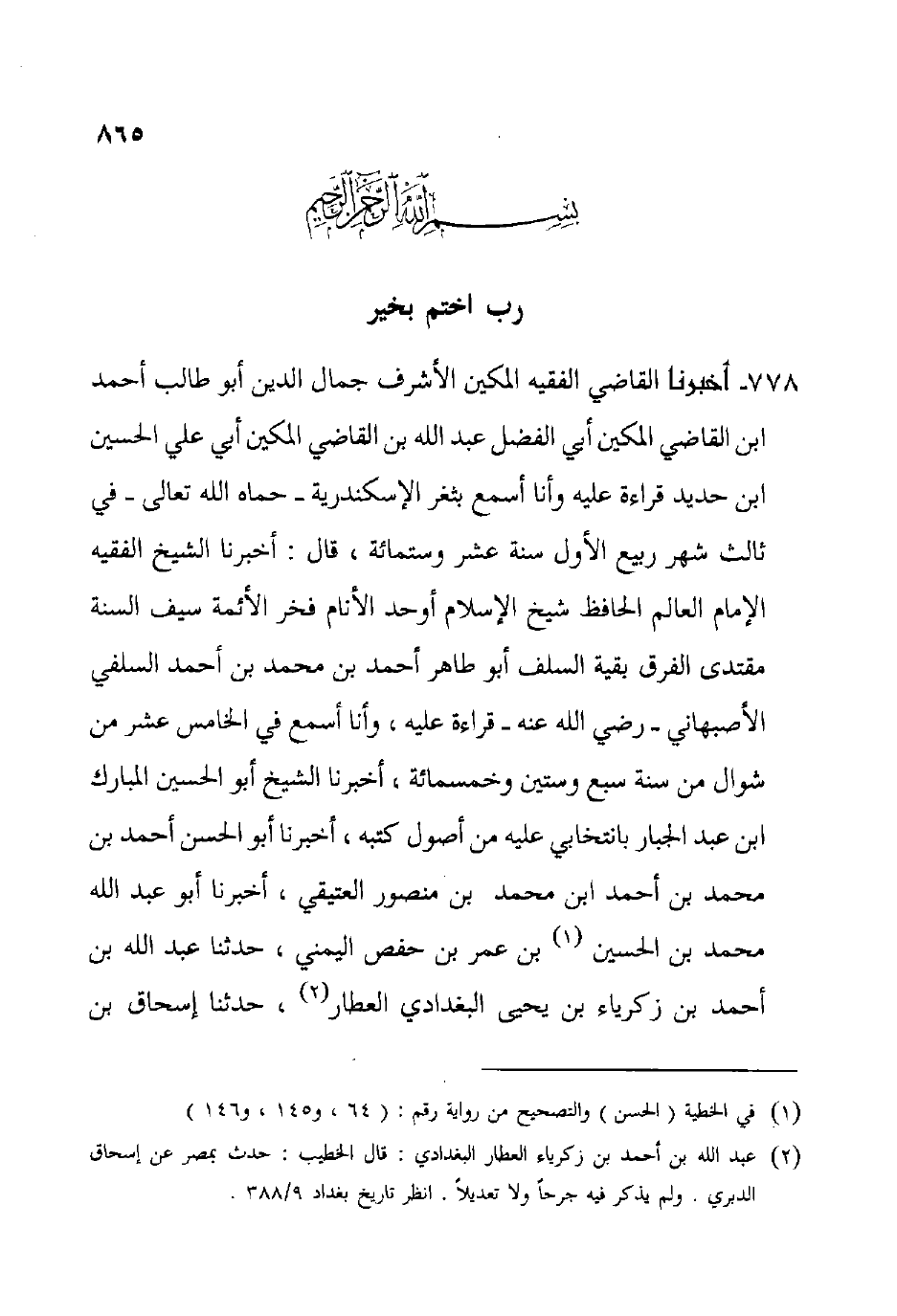 778 - أخبرنا القاضي الْفَقِيهُ الْمَكِينُ الأَشْرَفُ جَمَالُ الدِّينِ أبو طالب أحمد ابن القاضي المكين أبي الفضل عبد الله بن القاضي المكين أبي علي الحسين ابن حديد قراءة عليه وأنا أسمع بثغر الإسكندرية -حماه الله تعالى- في ثالث شهر ربيع الأول سنة عشر وستمائة، قال: أخبرنا الشيخ الفقيه الإمام العالم الحافظ شيخ الإسلام أوحد الأنام فخر الأئمة سيف السنة مقتدى الفرق بقية السلف أبو طاهر أحمد بن محمد بن أحمد السلفي الأصبهاني ـ رضي الله عنه ـ قراءة عَلَيْهِ، وَأَنَا أَسْمَعُ فِي الْخَامِسِ عشر من شوال من سنة سبع وستين وخمسمائة، أخبرنا الشيخ أبو الحسين المبارك بن عبد الجبار بانتخابي عليه من أصول كتبه، أَخْبَرَنَا أَبُو الْحَسَنِ أَحْمَدُ بن محمد بن أحمد ابن مُحَمَّدِ بْنِ مَنْصُورٍ الْعَتِيقِيُّ، أَخْبَرَنَا أَبُو عَبْدِ اللَّهِ مُحَمَّدُ بْنُ الْحُسَيْنِ (¬1) بْنِ عُمَرَ بْنِ حَفْصٍ الْيَمَنِيُّ، حَدَّثَنَا عَبْدُ اللَّهِ بْنُ أحمد ابن زَكَرِيَّاءَ بْنِ يَحْيَى الْبَغْدَادِيُّ الْعَطَّارُ (¬2) ، حَدَّثَنَا إِسْحَاقُ بْنُ
