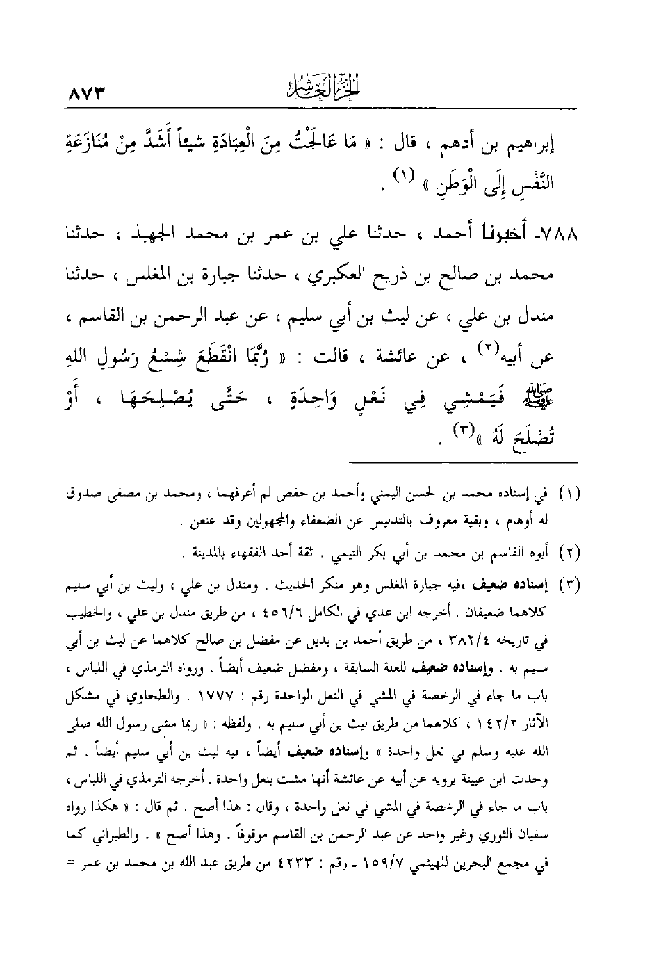 ابن ذُرَيْحٍ الْعُكْبَرِيُّ، حَدَّثَنَا جُبَارَةُ بْنُ الْمُغَلِّسِ، حَدَّثَنَا مَنْدَلُ بْنُ عَلِيٍّ، عن ليث ابن أَبِي سُلَيْمٍ، عَنْ عَبْدِ الرَّحْمَنِ بْنِ الْقَاسِمِ، عَنْ أَبِيهِ (¬2) ، عَنْ عَائِشَةَ، قَالَتْ: ((رُبَّمَا انْقَطَعَ شِسْعُ رَسُولِ اللهِ ـ صَلَّى اللهُ عَلَيْهِ وَسَلَّمَ ـ فَيَمْشِي فِي نَعْلٍ وَاحِدَةٍ، حَتَّى يُصْلِحَهَا، أَوْ تُصْلَحَ لَهُ)) (¬3)