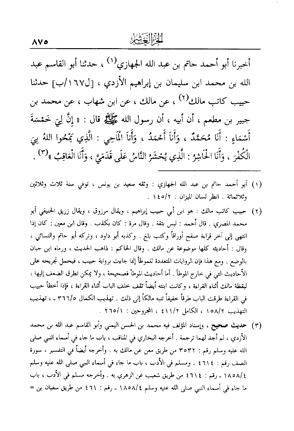 وعند عقيل قال: قلت للزهري: وما العاقب؟ قال: ا ((لذي ليس بعده نبي)) قلت: فتبين أن هذا التفسير مدرج من قول الزهري. وأشار إلى ذلك البيهقي في الدلائل 1/154. وأما قوله: ((وقد سماه الله رؤوفاً رحيماً)) فهو من قول الزهري بلا شك، صرح بذلك البيهقي، وأقره عليه الحافظ ابن حجر في الفتح 6/557.