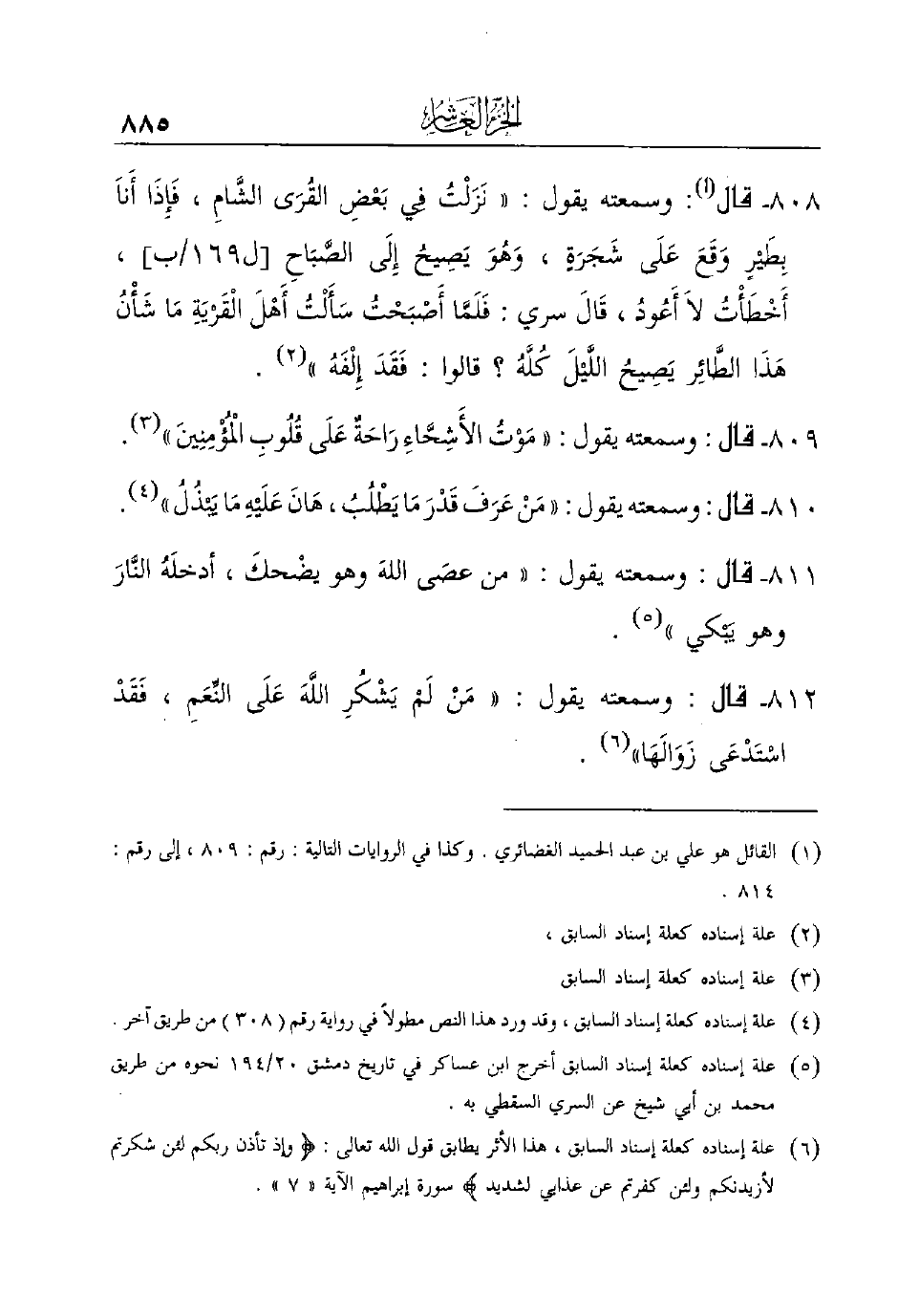 808 - قال (¬1) : وسمعته يقول: ((نَزَلْتُ فِي بَعْضِ القُرَى الشَّامِ، فَإِذَا أَناَ بِطَيْرٍ وَقَعَ عَلَى شَجَرَةٍ، وَهُوَ يَصِيحُ إِلَى الصَّبَاحِ [ل169/ب] ، أَخْطَأْتُ لاَ أَعُودُ، قَالَ سري: فَلَمَّا أَصْبَحْتُ سَأَلْتُ أَهْلَ الْقَرْيَةِ مَا شَأْنُ هَذَا الطَّائِر يَصِيحُ اللَّيْلَ كُلَّهُ؟ قالوا: فَقَدَ إِلِْفَهُ)) (¬2) .