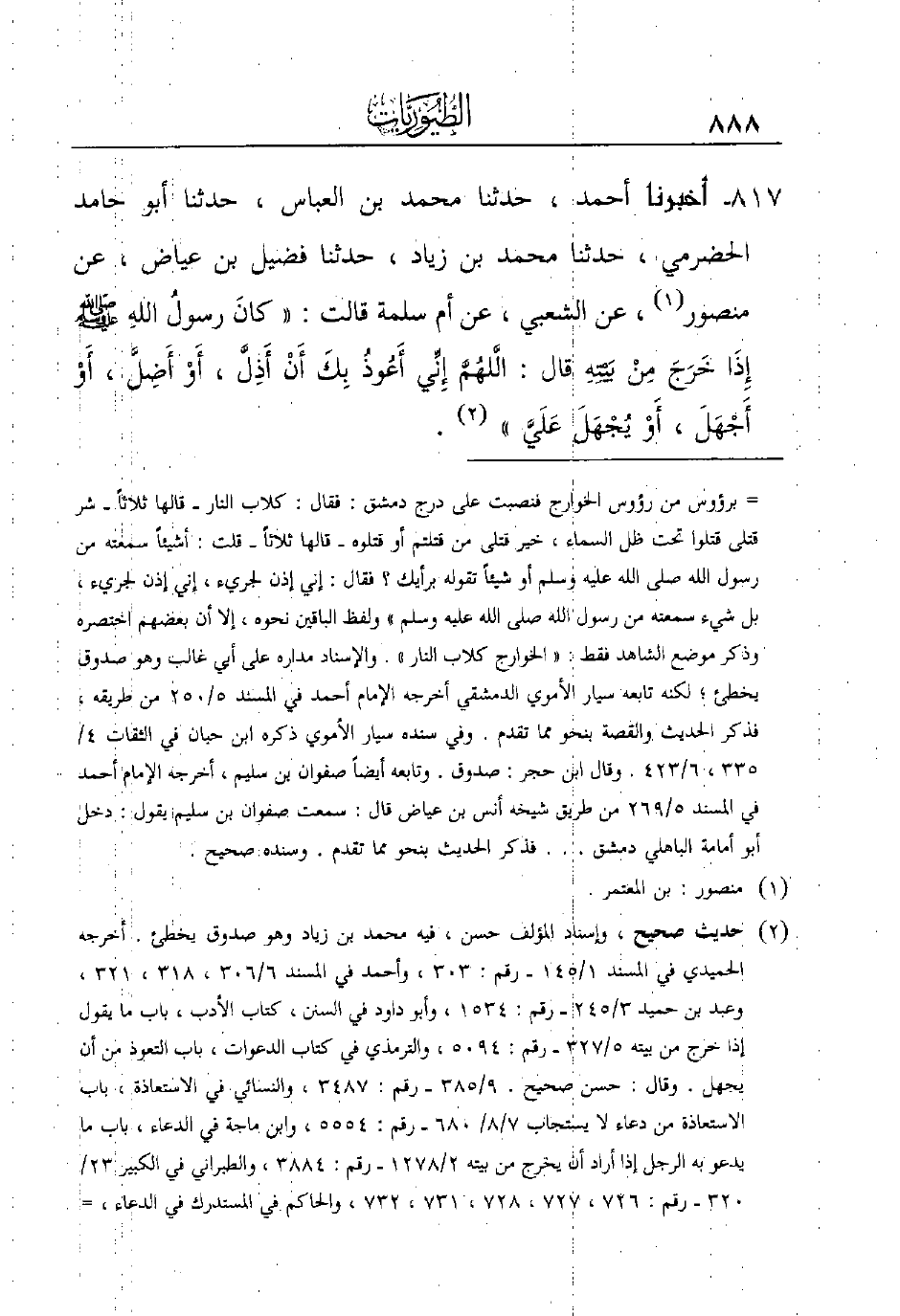 817 - أَخْبَرَنَا أَحْمَدُ، حَدَّثَنَا مُحَمَّدُ بْنُ الْعَبَّاسِ، حَدَّثَنَا أَبُو حَامِدٍ الْحَضْرَمِيُّ، حدثنا محمد ابن زِيَادٍ، حَدَّثَنَا فُضَيْلُ بْنُ عِيَاضٍ، عَنْ مَنْصُورٍ (¬1) ، عَنِ الشَّعْبِيِّ، عَنْ أُمِّ سَلَمَةَ قَالَتْ: ((كانَ رسولُ اللهِ ـ صَلَّى اللَّهُ عَلَيْهِ وَسَلَّمَ ـ إِذَا خَرَجَ مِنْ بَيْتِهِ قَالَ: الَّلهُمَّ إِنِّي أَعُوذُ بِكَ أَنْ أَذِلَّ، أَوْ أَضِلَّ، أَوْ أَجْهَلَ، أَوْ يُجْهَلَ عَلَيَّ)) (¬2) .