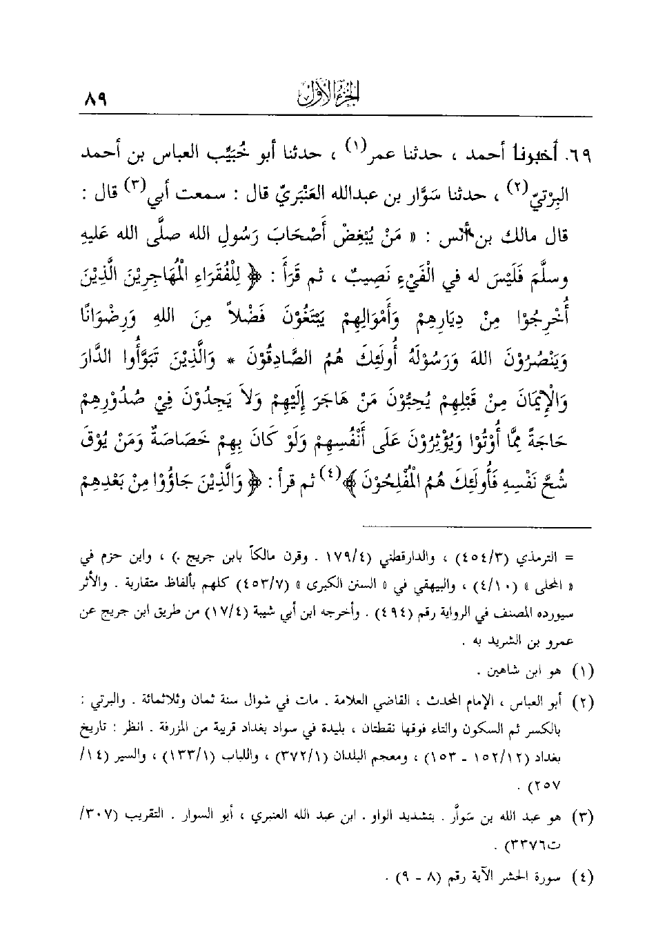 ، حدثنا سَوَّار بن عبد الله العَنْبَريّ قال: سمعت أبي (¬3) قال: قال مالك بن أنس: ((مَنْ يُبْغِضْ أَصْحَابَ رَسُولِ الله صلَّى الله عَليهِ وسلَّمَ فَلَيْسَ له في الْفَيْءِ نَصِيبٌ، ثم قَرَأَ: {لِلْفُقَرَاءِ الْمُهَاجِرِيْنَ الَّذِيْنَ أُخْرِجُوْا مِنْ دِيَارِهِمْ وَأَمْوَالِهِمْ يَبْتَغُوْنَ فَضْلاً مِنَ اللهِ وَرِضْوَانًا وَيَنْصُرُوْنَ اللهَ وَرَسُوْلَهُ أُولَئِكَ هُمُ الصَّادِقُوْنَ * وَالَّذِيْنَ تَبَوَّأُوا الدَّارَ وَالْإِيْمَانَ مِنْ قَبْلِهِمْ يُحِبُّوْنَ مَنْ هَاجَرَ إِلَيْهِمْ وَلاَ يَجِدُوْنَ فِيْ صُدُوْرِهِمْ حَاجَةً مِمَّا أُوْتُوْا وَيُؤْثِرُوْنَ عَلَى أَنْفُسِهِمْ وَلَوْ كَانَ بِهِمْ خَصَاصَةٌ وَمَنْ يُوْقَ شُحَّ نَفْسِهِ فَأُولَئِكَ هُمُ الْمُفْلِحُوْنَ (¬4) } ثم قرأ: {وَالَّذِيْنَ جَاؤُوْا مِنْ بَعْدِهِمْ