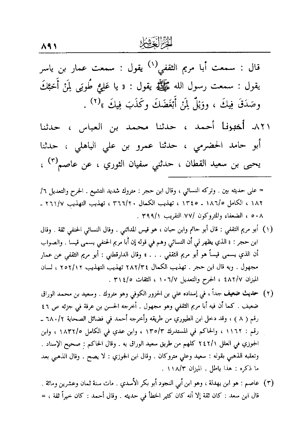 الثَّقَفِيَّ (¬1) يَقُولُ: سَمِعْتُ عَمَّارَ بْنَ يَاسِرٍ يَقُولُ: سَمِعْتُ رَسُولَ اللَّهِ ـ صَلَّى اللَّهُ عَلَيْهِ وَسَلَّمَ ـ يَقُولُ: ((يَا عَلِيُّ طُوبَى لِمَنْ أَحَبَّكَ وصَدَقَ فِيكَ، ووَيْلٌ لِمَنْ أَبْغَضَكَ وكَذَبَ فِيكَ)) (¬2) .