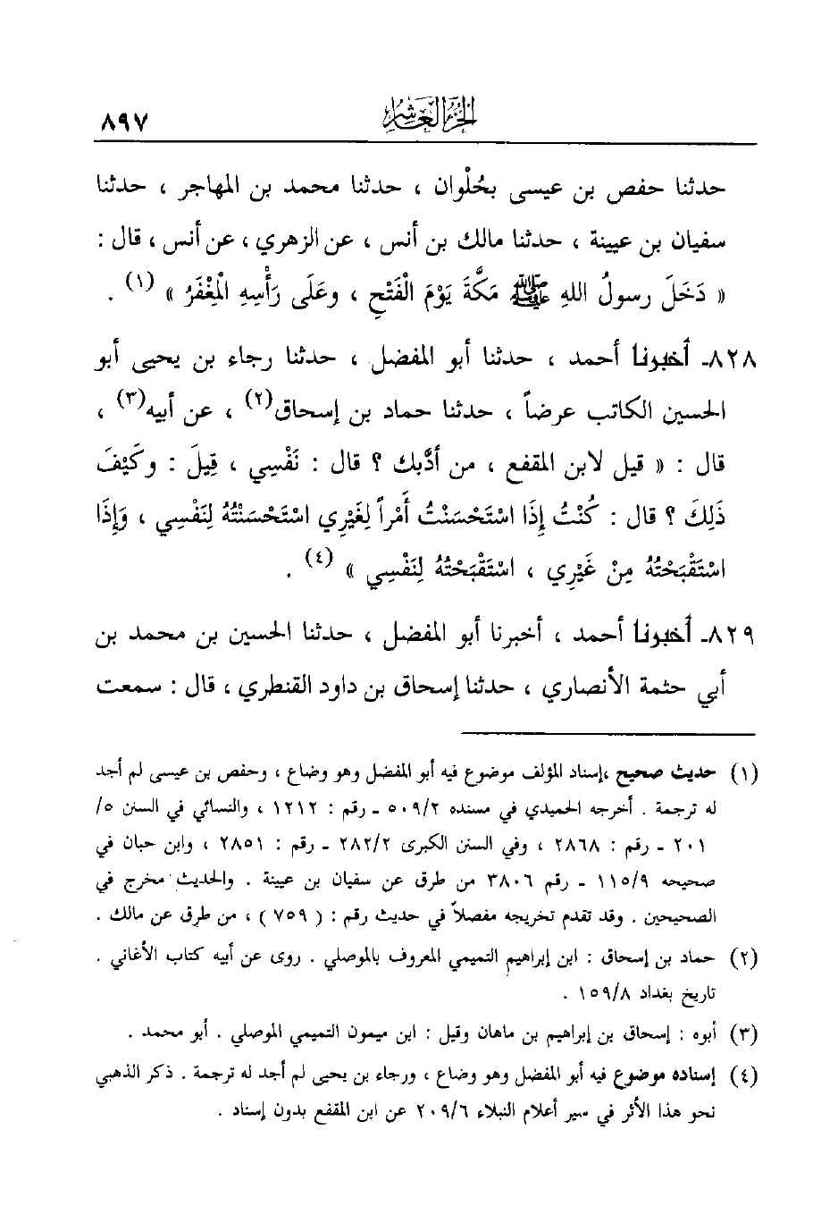828 - أَخْبَرَنَا أَحْمَدُ، حدثنا أبو المفضل، حدثنا رجاء بن يحيى أبو الحسين الكاتب عرضًا، حدثنا حماد بن إسحاق (¬2) ، عن أبيه (¬3) ، قال: ((قيل لابن المقفع، من أدَّبك؟ قال: نَفْسِي، قِيلَ: وكَيْفَ ذَلِكَ؟ قال: كُنْتُ إِذَا اسْتَحْسَنْتُ أَمْراً لِغَيْرِي اسْتَحْسَنْتُهُ لِنَفْسِي، وَإِذَا اسْتَقْبَحْتُهُ مِنْ غَيْرِي، اسْتَقْبَحْتُهُ لِنَفْسِي)) (¬4) .