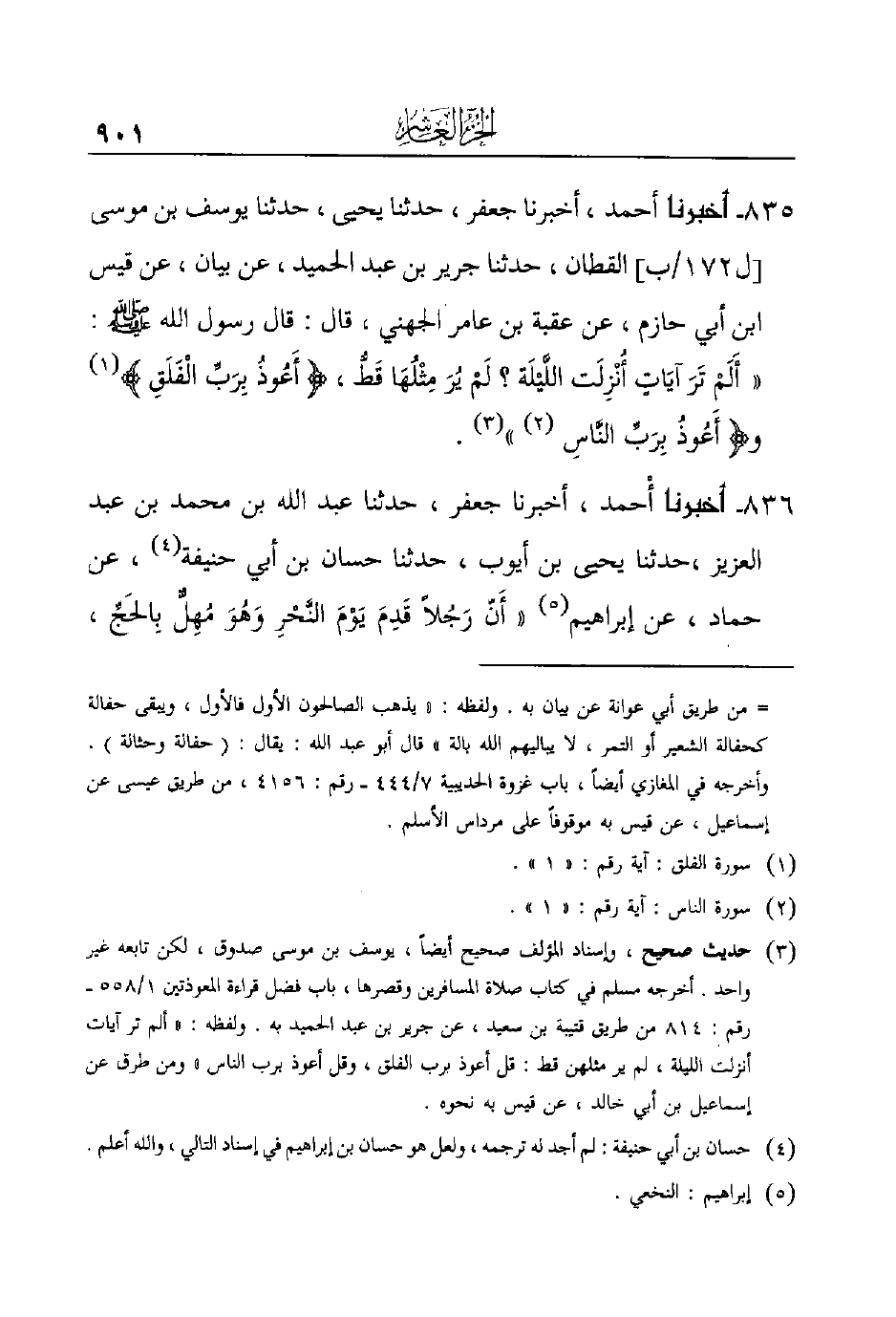 835 - أَخْبَرَنَا أَحْمَدُ، أَخْبَرَنَا جَعْفَرٌ، حَدَّثَنَا يَحْيَى، حَدَّثَنَا يُوسُفُ بْنُ مُوسَى [ل172/ب] الْقَطَّانُ، حَدَّثَنَا جَرِيرُ بْنُ عَبْدِ الْحَمِيدِ، عَنْ بَيَانٍ، عَنْ قَيْسِ بْنِ أَبِي حَازِمٍ، عَنْ عُقْبَةَ ابن عَامِرٍ الْجُهَنِيِّ، قَالَ: قَالَ رَسُولُ اللَّهِ ـ - صَلَّى اللَّهُ عَلَيْهِ وَسَلَّمَ - ـ: ((أَلَمْ تَرَ آيَاتٍ أُنْزِلَتْ اللَّيْلَةُ؟ لَمْ يُرَ مِثْلُهَا قَطُّ،