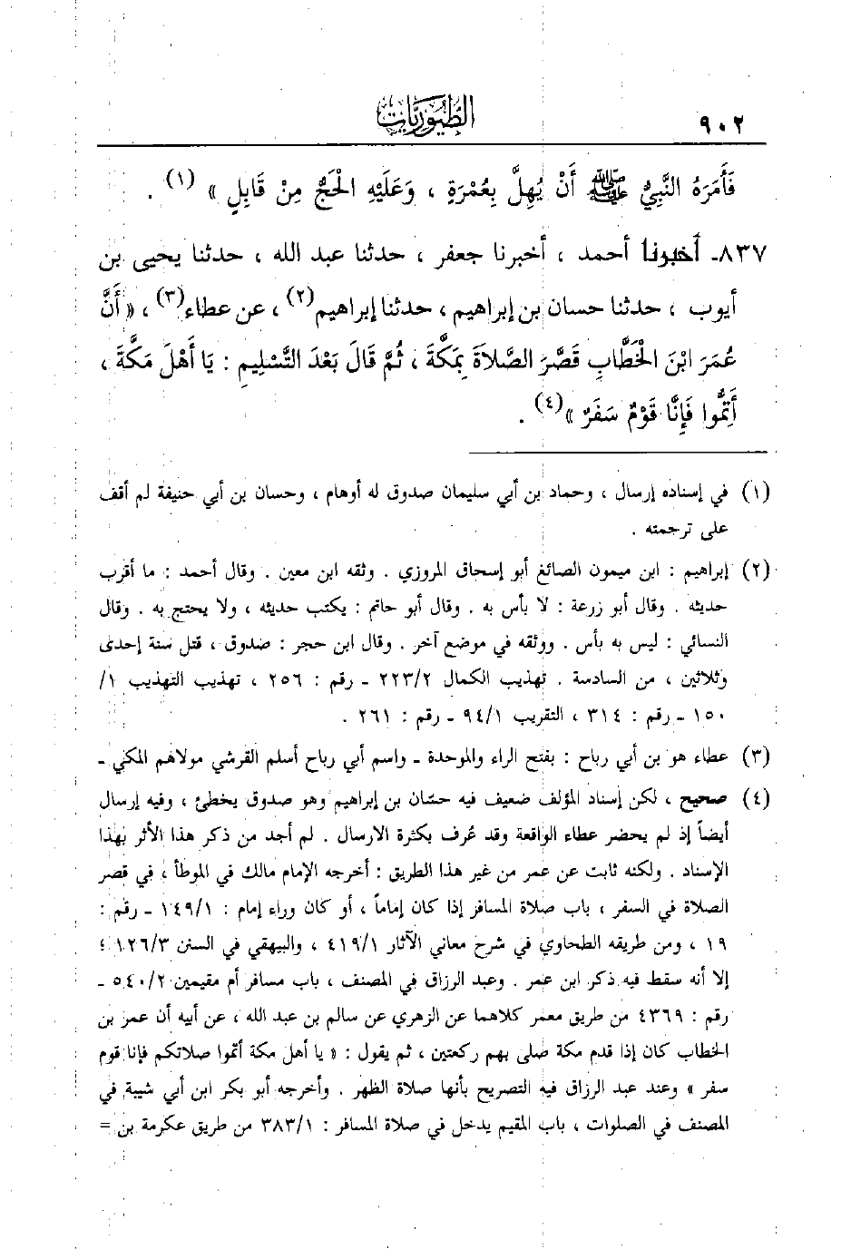 حسان بن إبراهيم، حدثنا إبراهيم (¬2) ، عن عطاء (¬3) ، ((أَنَّ عُمَرَ ابْنَ الْخَطَّابِ قَصَّرَ الصَّلاَةَ بِمَكَّةَ، ثُمَّ قَالَ بَعْدَ التَّسْلِيمِ: يَا أَهْلَ مَكَّةَ، أَتِمُّوا فَإِنَّا قَوْمٌ سَفَرٌ)) (¬4)