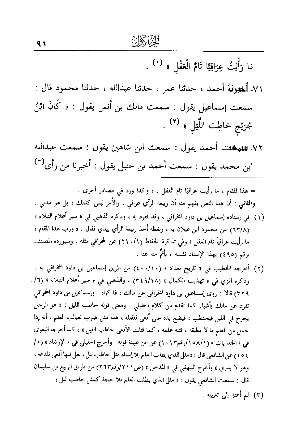 71 - أخبرنا أحمد، حدثنا عمر، حدثنا عبد الله، حدثنا محمود قال: سمعت إسماعيل يقول: سمعت مالك بن أنس يقول: ((كَانَ ابْنُ جُرَيْجٍ حَاطِبَ اللَّيْلِ)) (¬2) .