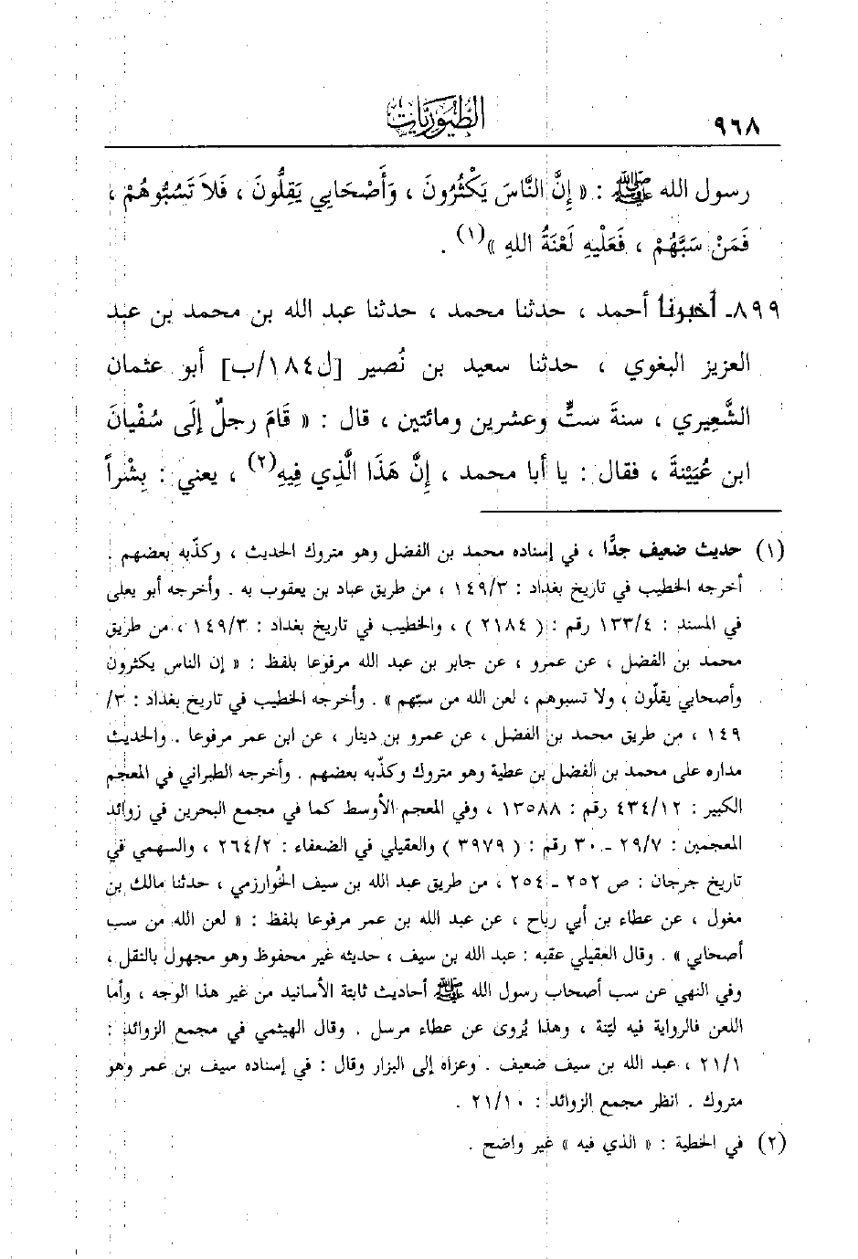 899 - أَخْبَرَنَا أَحْمَدُ، حَدَّثَنَا مُحَمَّدٌ، حَدَّثَنَا عبد الله بن محمد بن عبد العزيز البغوي، حدثنا سعيد بن نُصير [ل184/ب] أبو عثمان الشَّعِيري، سنةَ ستٍّ وعشرين ومائتين، قال: ((قَامَ رجلٌ إلَى سُفْيانَ بن عُيَيْنةَ، فقال: يا أبا محمد، إِنَّ هَذَا الَّذِي فِيهِ (¬2) ، يعني: بِشْراً