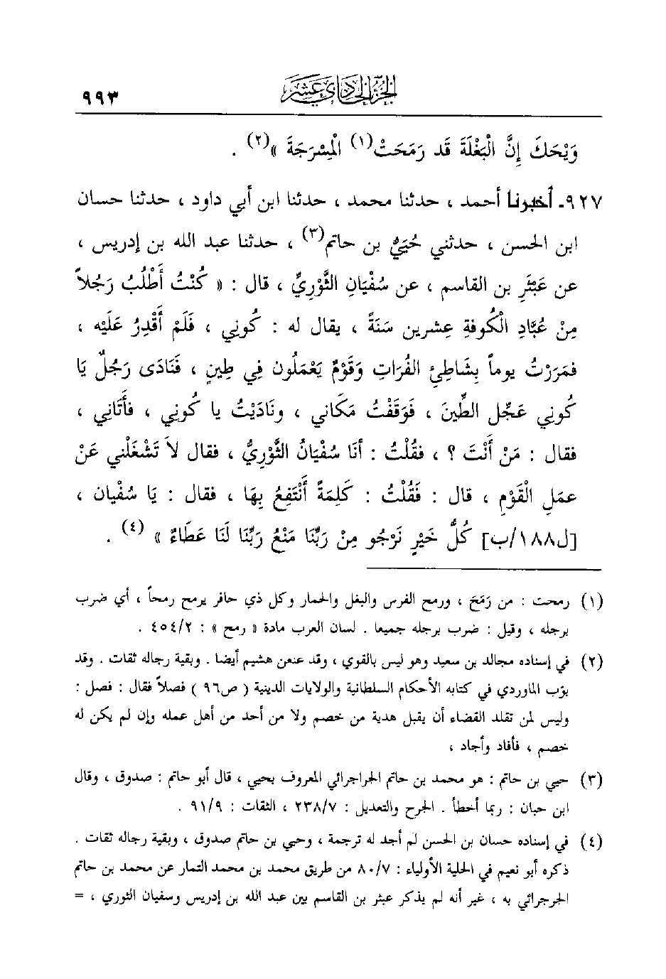 927 - أَخْبَرَنَا أَحْمَدُ، حَدَّثَنَا مُحَمَّدٌ، حَدَّثَنَا ابن أبي داود، حدثنا حسان ابن الحسن، حدثني حُيَبيُّ ابن حاتم (¬3) ، حدثنا عبد الله بن إدريس، عن عَبْثَرِ بن القاسم، عن سُفْيَانِ الثَّوْرِيِّ، قال: ((كُنْتُ أَطْلُبُ رَجُلاً مِنْ عُبَّادِ الْكُوفةِ عِشرين سَنَةً، يقال له: كُونِي، فَلَمْ أَقْدِرُ عَلَيْه، فمَرَرْتُ يومًا بِشَاطِئِ الفُرَاتِ وَقَوْمٌ يَعْمَلُون فِي طِينٍ، فَنَادَى رَجُلٌ يَا كُونِي عَجِّل الطِّينَ، فَوَقَفْتُ مَكَاني، ونَادَيْتُ يا كُونِي، فأَتَانِي، فقال: مَنْ أَنْتَ؟، فقُلْتُ: أنَا سُفْيَانُ الثَّوْرِيُّ، فقال لاَ تَشْغَلْني عَنْ عمَلِ الْقَوْمِ، قال: فَقُلْتُ: كَلِمَةً أَنْتَفِعُ بِهَا، فقال: يَا سُفْيان، [ل188/ب] كُلُّ خَيْرٍ نَرْجُو مِنْ رَبِّنَا مَنْعُ رَبِّنَا لَنَا عَطَاءٌ)) (¬4) .
