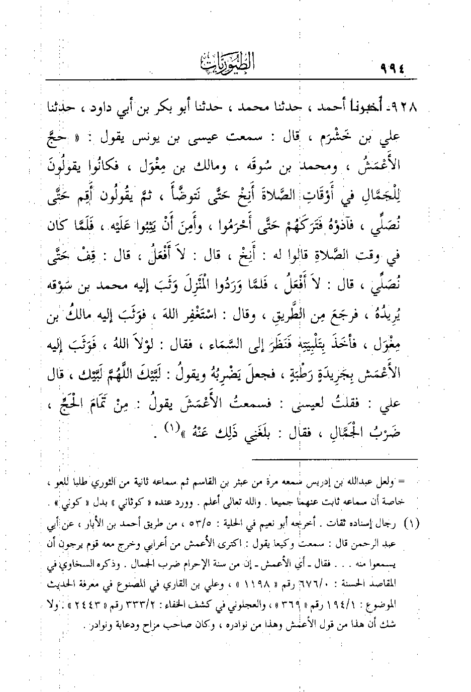 928 - أَخْبَرَنَا أَحْمَدُ، حَدَّثَنَا مُحَمَّدٌ، حَدَّثَنَا أَبُو بَكْرِ بْنُ أَبِي دَاوُدَ، حدثنا علي بن خَشْرَم، قال: سمعت عيسى بن يونس يقول: ((حجَّ الأَعْمَشُ، ومحمد بن سُوقَه، ومالك بن مِغْوَل، فكانُوا يقولُونَ لِلْجَمَّالِ في أَوْقَاتِ الصَّلاةَ أَنِخْ حَتَّى نَتوضَّأَ، ثمَّ يقُولُون أَقِم حَتَّى نُصَلِّي، فآذوْهُ فَتَرَكَهُمْ حَتَّى أَحْرَمُوا، وأَمِنَ أَنْ يَثِبُوا عَلَيْه، فَلَمَّا كان في وقت الصَّلاةِ قالوا له: أَنِخْ، قال: لاَ أَفْعَلُ، قال: قِفْ حَتَّى نُصَلِّي، قال: لاَ أَفْعَلُ، فَلمَّا وَرَدُوا الْمَنْزِلَ وَثَبَ إليه محمد بن سَوْقه يُرِيدُهُ، فرجَعَ مِن الطَّريقِ، وقال: اسْتَغْفِر اللهَ، فوَثَبَ إليه مالكُ بن مِغْوَل، فأخَذَ بِتَلْبِيَتِه فَنَظَرَ إلى السَّمَاء، فقال: لوْلاَ اللهُ، فَوَثَبَ إليه الأَعْمَش بِجَرِيدَةٍ رَطْبَةٍ، فجعلَ يَضْرِبُهُ ويقولُ: لَبَّيْكَ اللَّهُمَّ لَبَّيْك، قال علي: فقلتُ لعيسى: فسمعتُ الأَعْمَشَ يقولُ: مِنْ تَمَامَ الْحَجِّ، ضَرْبُ الْجَمَّالِ، فقال: بلَغَنِي ذَلِك عَنْهُ)) (¬1) .