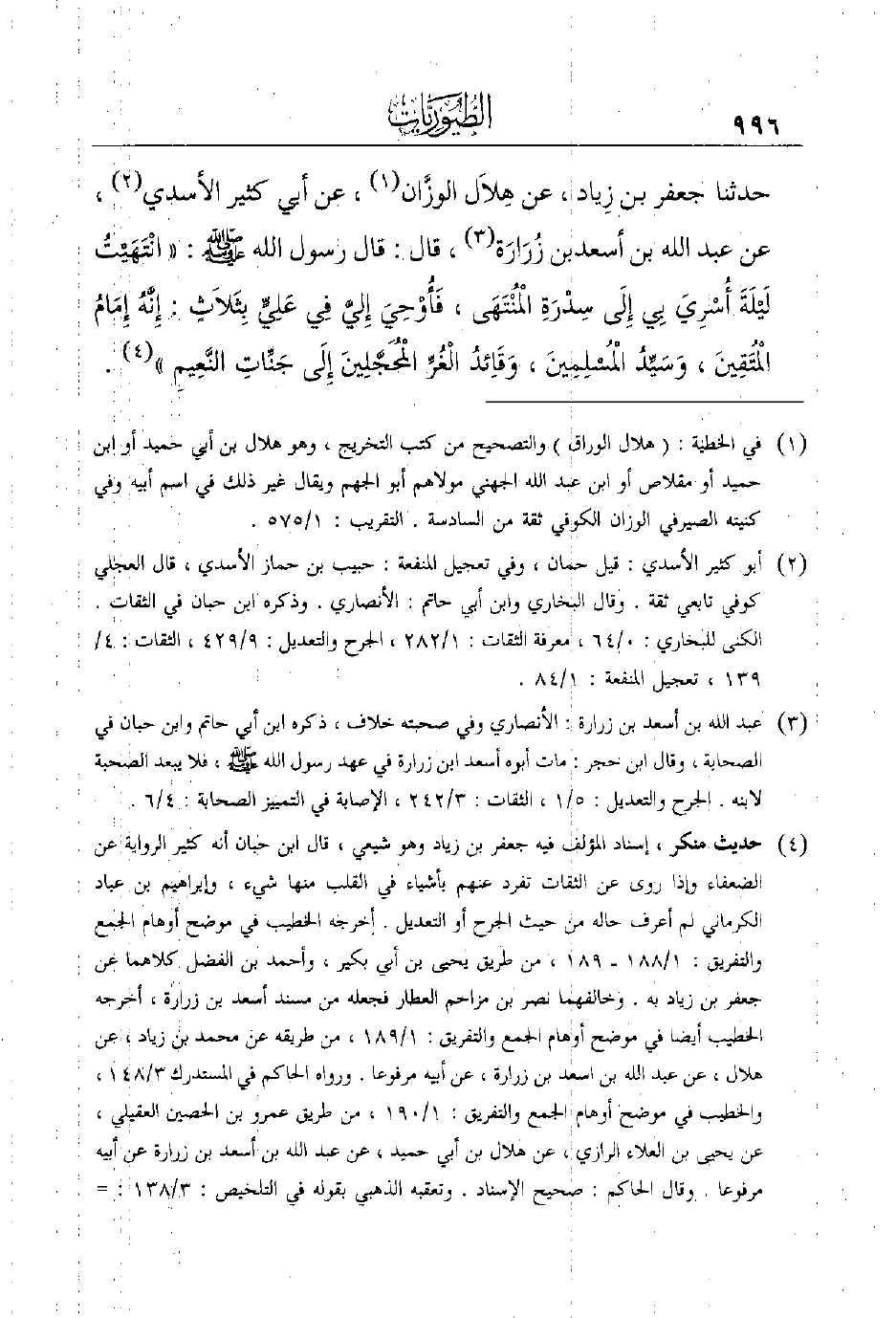 ابن زُرَارَة (¬3) ، قَالَ: قَالَ رَسُولُ اللَّهِ - صَلَّى اللَّهُ عَلَيْهِ وَسَلَّمَ -: ((انْتَهَيْتُ لَيْلَةَ أُسْرِيَ بِي إِلَى سِدْرَةِ الْمُنْتَهَى، فَأُوْحِيَ إِليَّ فِي عَلِيٍّ بِثَلاَثٍ: إِنَّهُ إِمَامُ الْمُتَّقِينَ، وَسَيِّدُ الْمُسْلِمِينَ، وَقَاِئدُ الْغُرِّ الْمُحَجَّلِينَ إِلَى جَنِّاتِ النَّعِيمِ)) (¬4)
