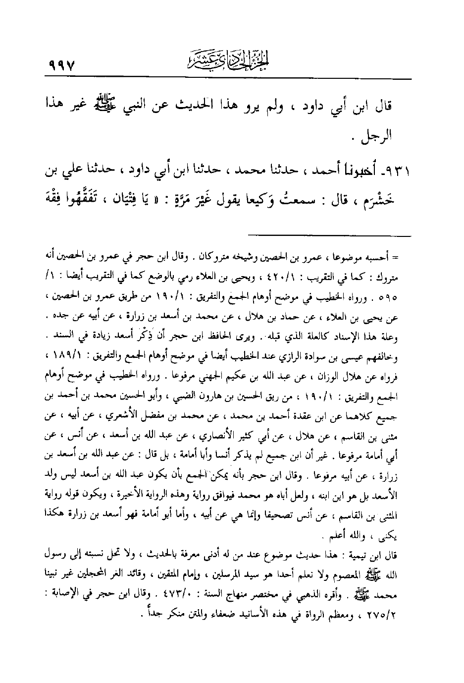 931 - أخبرنا أحمد، حدثنا مُحَمَّدٌ، حَدَّثَنَا ابْنُ أَبِي دَاوُدَ، حدثنا علي بن خَشْرَم، قال: سمعتُ وَكيعا يقول غَيْرَ مَرَّةٍ: ((يَا فِتْيَان، تَفَقَّهُوا فِقْهَ