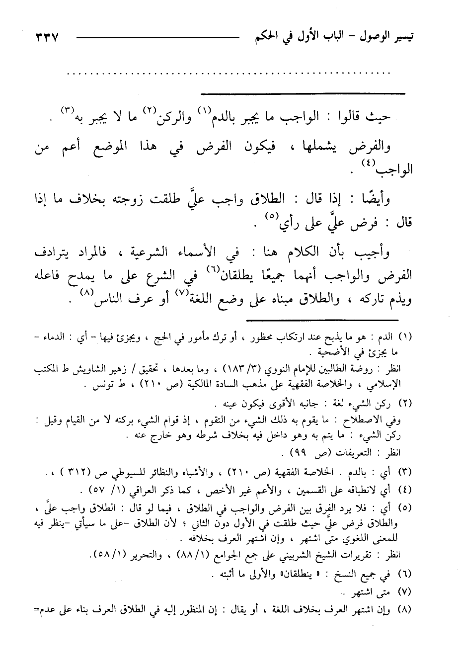 وأجيب بأن الكلام هنا: في الأسماء الشرعية، فالمراد يترادف الفرض والواجب أنهما جميعًا يطلقان في الشرع على ما يمدح فاعله ويذم تاركه، والطلاق مبناه على وضع اللغة أو عرف الناس.