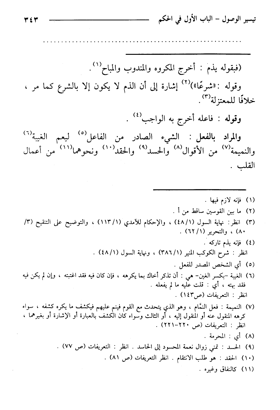 والمراد بالفعل: الشيء الصادر من الفاعل ليعم الغيبة والنميمة من الأقوال والحسد والحقد ونحوهما من أعمال القلب.