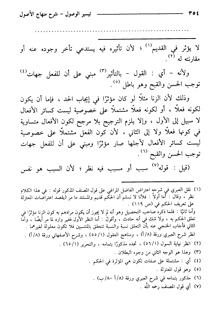 وذلك لأن الزنا مثلًا لو كان مؤثرًا في إيجاب الحد، فإما أن يكون لكونه فعلًا، أو لكونه فعلًا مشتملًا على خصوصية ليست كسائر الأفعال لا سبيل إلى الأول، وإلا يلزم الترجيح بلا مرجح لكون الأفعال متساوية في كونها فعلًا ولا إلى الثاني، لأن كون الفعل مشتملًا على خصوصية ليست كسائر الأفعال لأجلها صار مؤثرًا ومبني على أن للفعل جهات توجب الحسن والقبح.