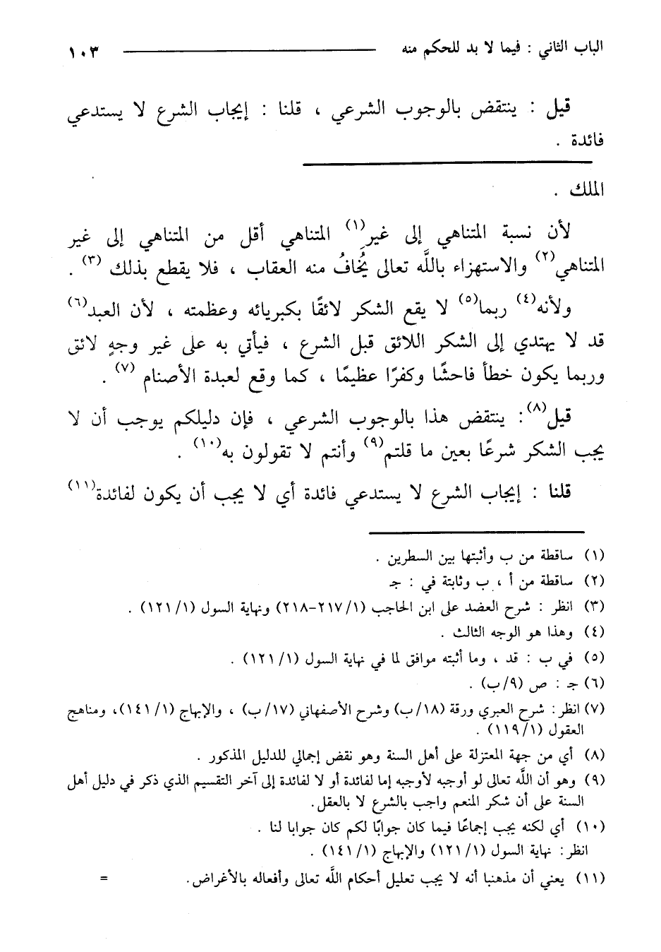 ولأنه ربما لا يقع الشكر لائقًا بكبريائه وعظمته، لأن العبد قد لا يهتدي إلى الشكر اللائق قبل الشرع، فيأتي به على غير وجهٍ لائق وربما يكون خطأ فاحشًا وكفرًا عظيمًا، كما وقع لعبدة الأصنام.