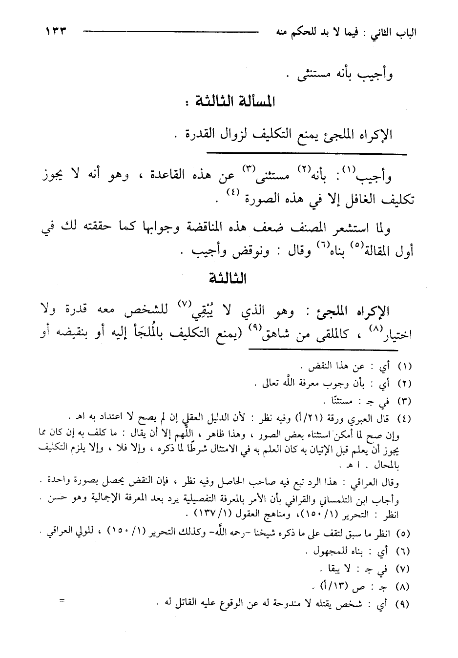 الثالثة: الإكراه الملجئ: وهو الذي لا يبقى للشخص معه قدرة ولا اختيار، كالملقى من شاهق (يمنع التكليف بالملجأ إليه أو بنقيضه أو