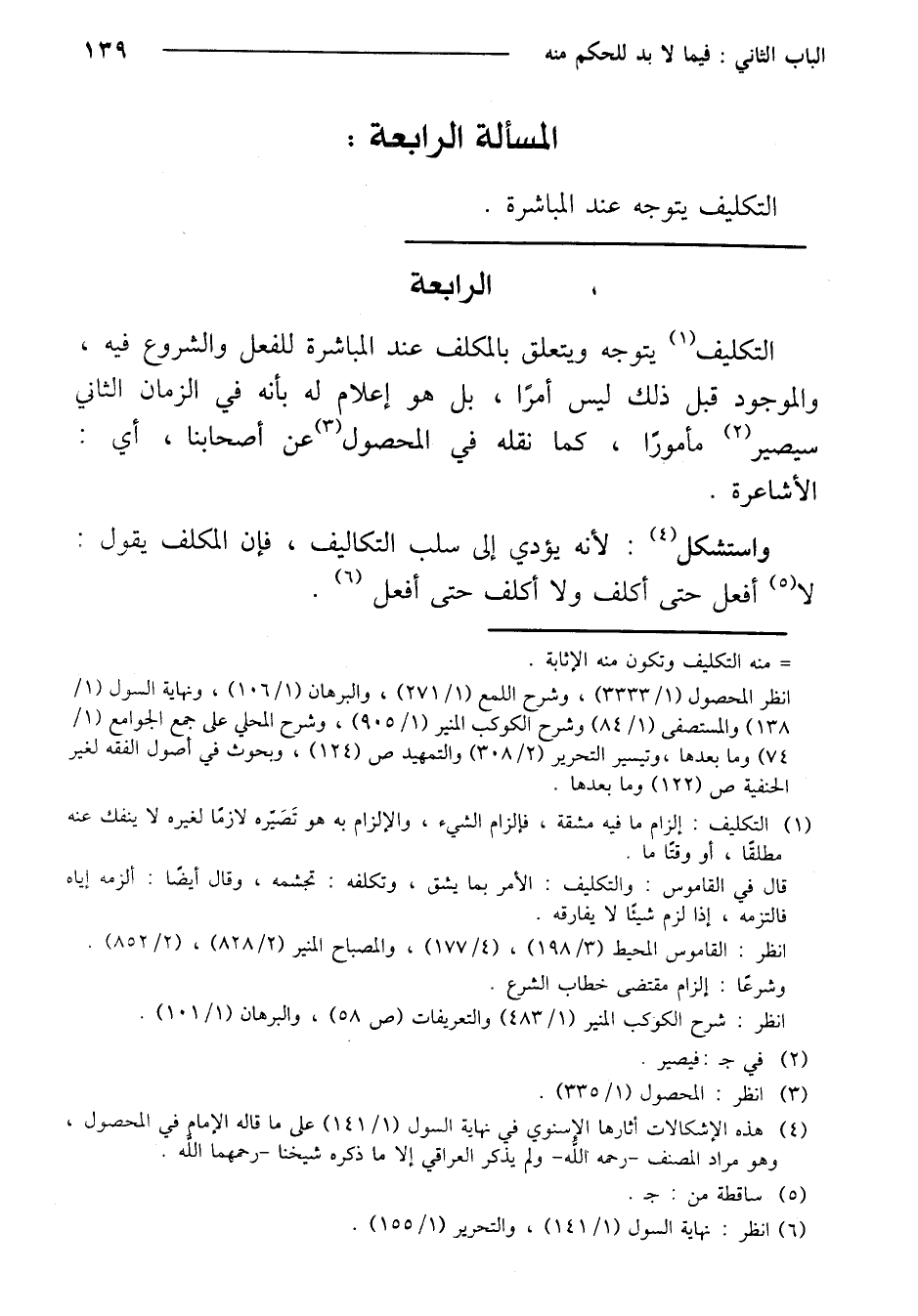 الرابعة: التكليف يتوجه ويتعلق بالمكلف عند المباشرة للفعل والشروع فيه، والموجود قبل ذلك ليس أمرًا، بل هو إعلام له بأنه في الزمان الثاني سيصير مأمورًا، كما نقله في المحصول عن أصحابنا، أي: الأشاعرة.