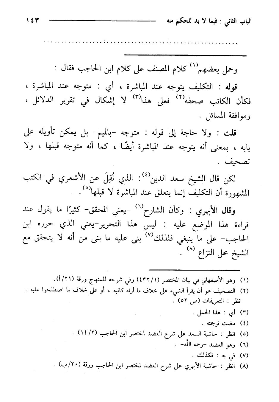 وقال الأبهري: وكأن الشارح - يعني المحقق - كثيرًا ما يقول عند قراءة هذا الموضع عليه: ليس هذا التحرير - يعني الذي حرره ابن الحاجب - على ما ينبغي فلذلك بنى عليه ما بنى من أنه لا يتحقق مع الشيخ محل النزاع.