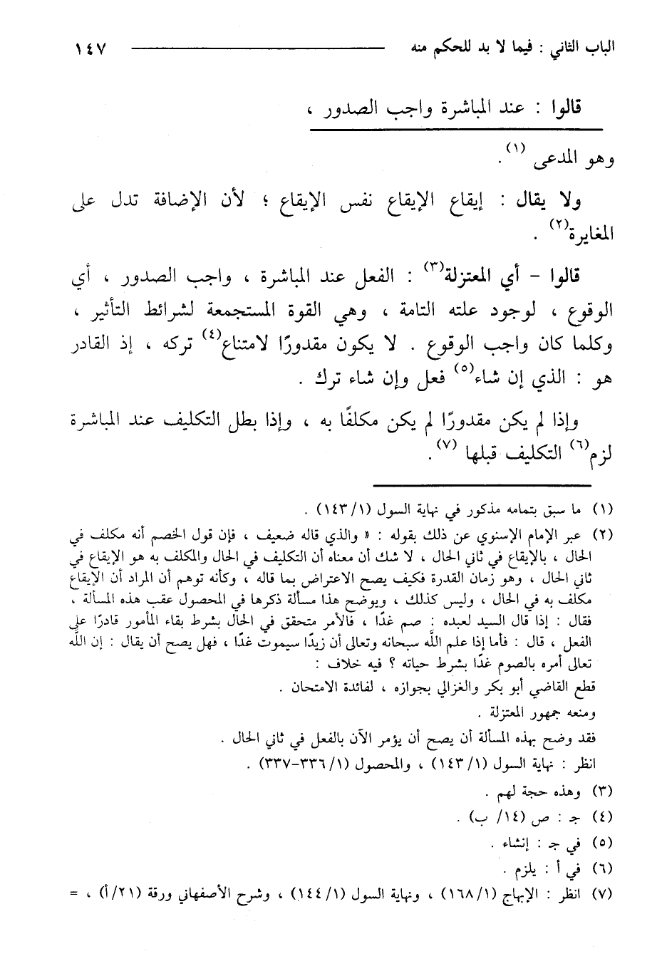 قالوا - أي المعتزلة: الفعل عند المباشرة، واجب الصدور، أي الوقوع، لوجود علته التامة، وهي القوة المستجمعة لشرائط التأثير، وكلما كان واجب الوقوع. لا يكون مقدورًا لامتناع تركه، إذ القادر هو: الذي إن شاء فعل وإن شاء ترك.