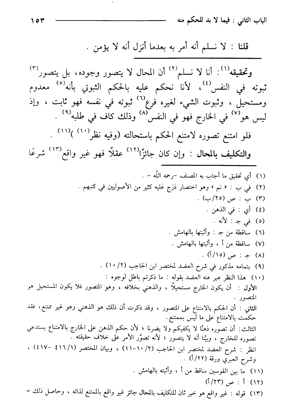 وتحقيقه: أنا لا نسلم أن المحال لا يتصور وجوده، بل يتصور ثبوته في النفس، لأنا نحكم عليه بالحكم الثبوتي بأنه معدوم ومستحيل، وثبوت الشيء ليغره فرع ثبوته في نفسه فهو ثابت، وإذ ليس هو في الخارج فهو في النفس وذلك كاف في طلبه.