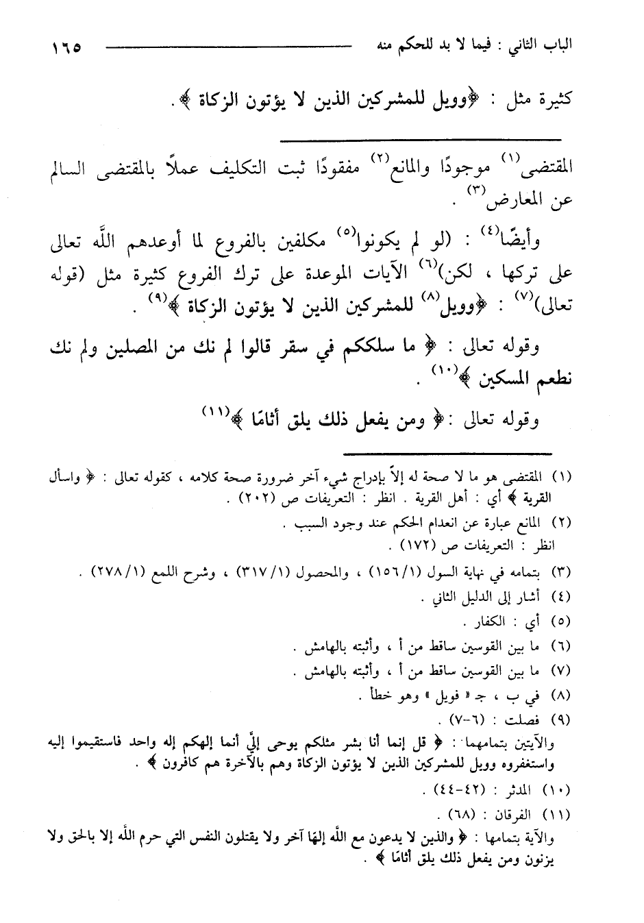 وأيضًا: (لو لم يكونوا مكلفين بالفروع لما أوعدهم الله تعالى على تركها، لكن) الآيات الموعدة على ترك الفروع كثيرة مثل (قوله تعالى): } وويل للمشركين الذين لا يؤتون الزكاة {.