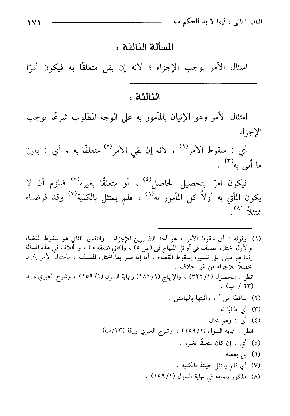 فيكون أمرًا بتحصيل الحاصل، أو متعلقًا بغيره فيلزم أن لا يكون المأتي به أولاً كل المأمور به، فلم يمتثل بالكلية وقد فرضناه ممتثلاً.