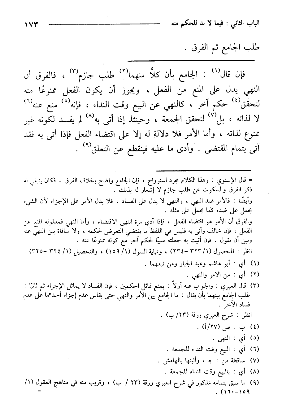 فإن قال: الجامع بأن كلا منهما طلب جازم، فالفرق أن النهي يدل على المنع من الفعل، ويجوز أن يكون الفعل ممنوعًا منه لتحقيق حكم آخر، كالنهي عن البيع وقت النداء، فإنه منع عنه لا لذاته، بل لتحقق الجمعة، وحينئذ إذا أتى به لم يفسد لكونه غير ممنوع لذاته، وأما الأمر فلا دلالة له إلا على اقتضاء الفعل فإذا أتى به فقد أتى بتمام المقتضى. وأدى ما عليه فينقطع عن التعلق.