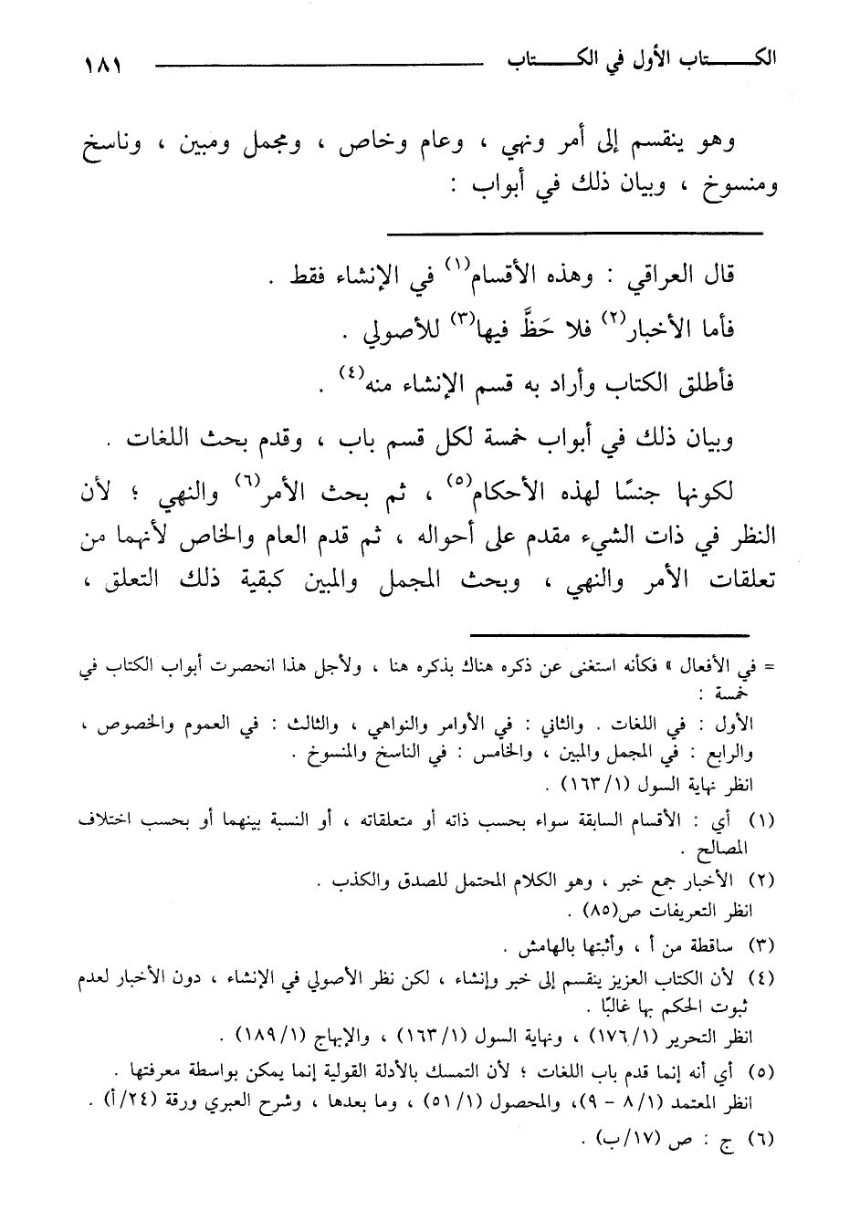 وبيان ذلك في أبواب خمسة لكل قسم باب، وقدم بحث اللغات.