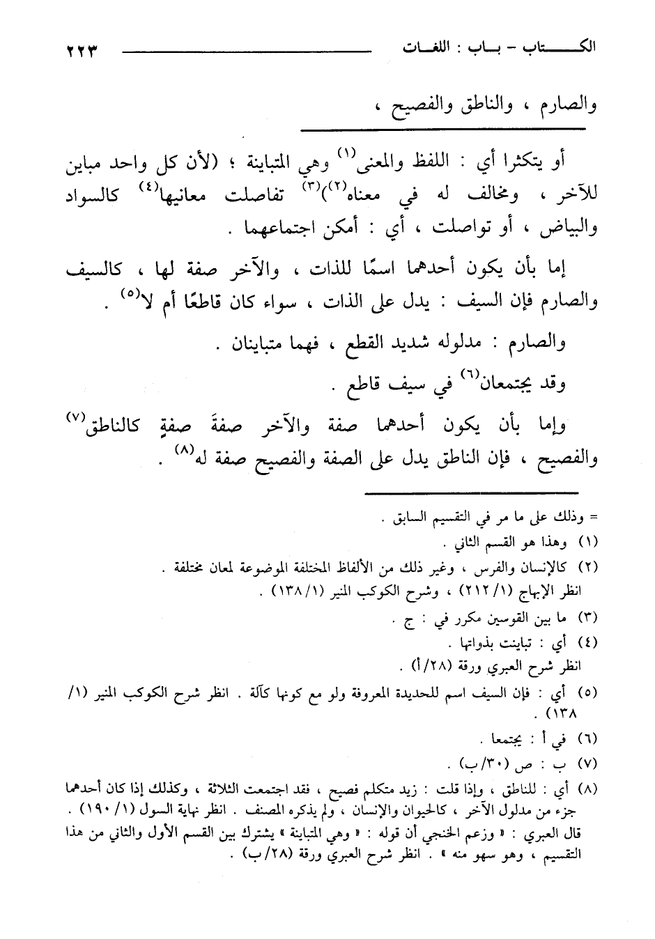 وإما بأن يكون أحدهما صفة والآخر صفة صفةٍ كالناطق والفصيح، فإن الناطق يدل على الصفة والفصيح صفة له.