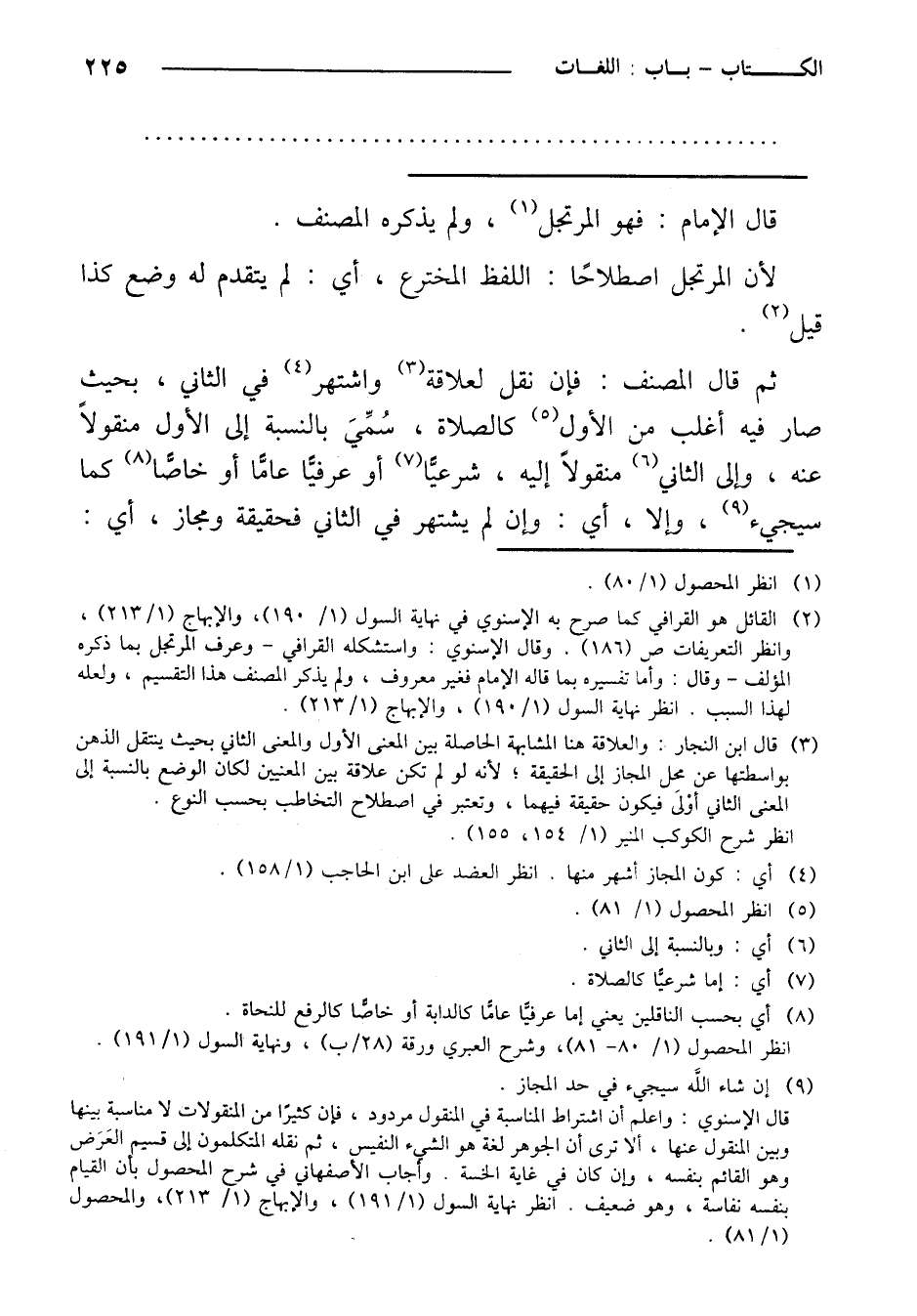 ثم قال المصنف: فإن نقل لعلاقة واشتهر في الثاني، بحيث صار فيه أغلب من الأول كالصلاة، سمي بالنسبة إلى الأول منقولًا عنه، وإلى الثاني منقولًا إليه، شرعيًا أو عرفيًا عامًا أو خاصًا كما سيجيء، وإلا، أي: وإن لم يشتهر في الثاني فحقيقة ومجاز، أي: