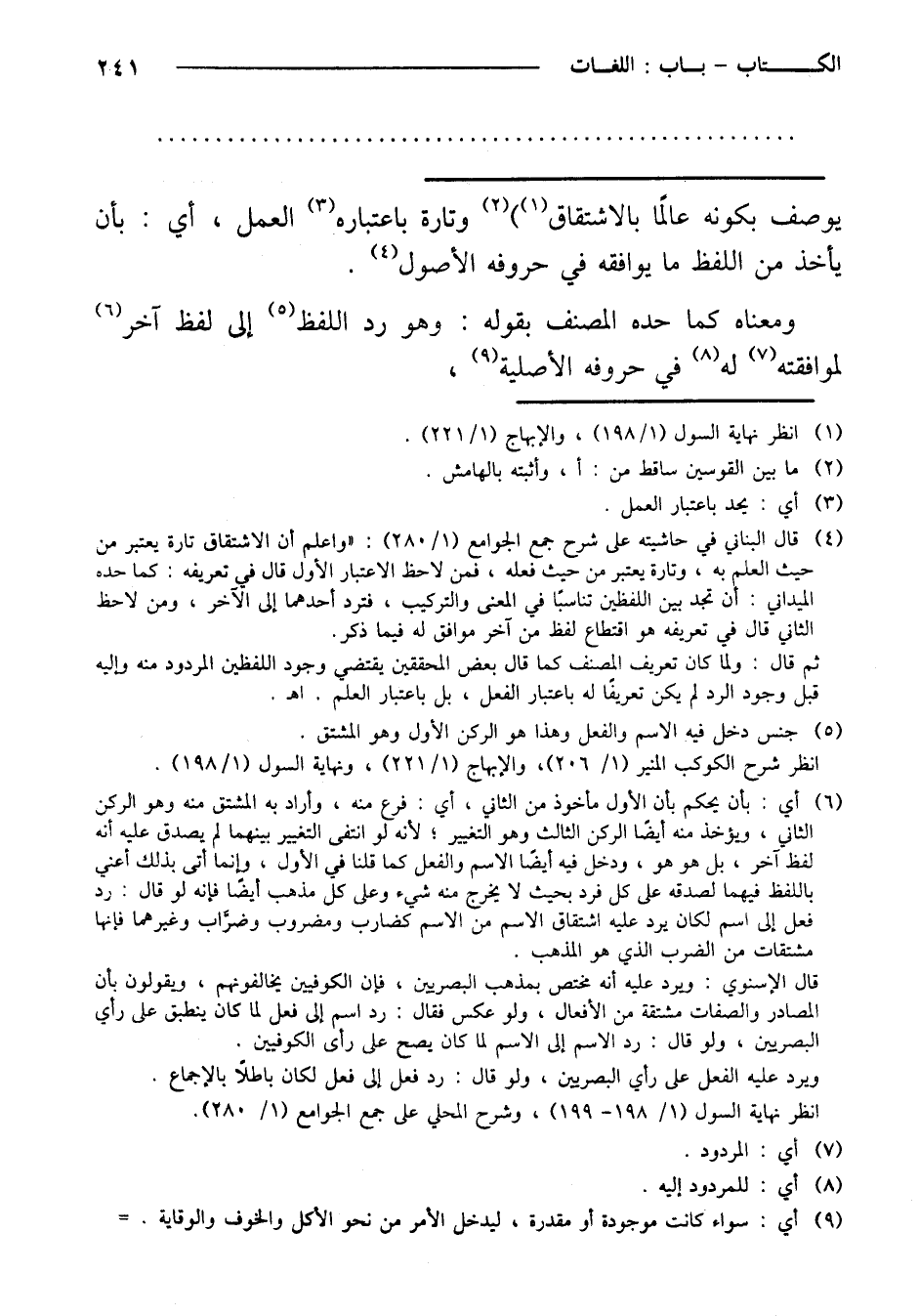 يوصف بكونه عالمًا بالاشتقاق) وتارة باعتباره العمل، أي: بأن يأخذ من اللفظ ما يوافقه في حروفه الأصول.