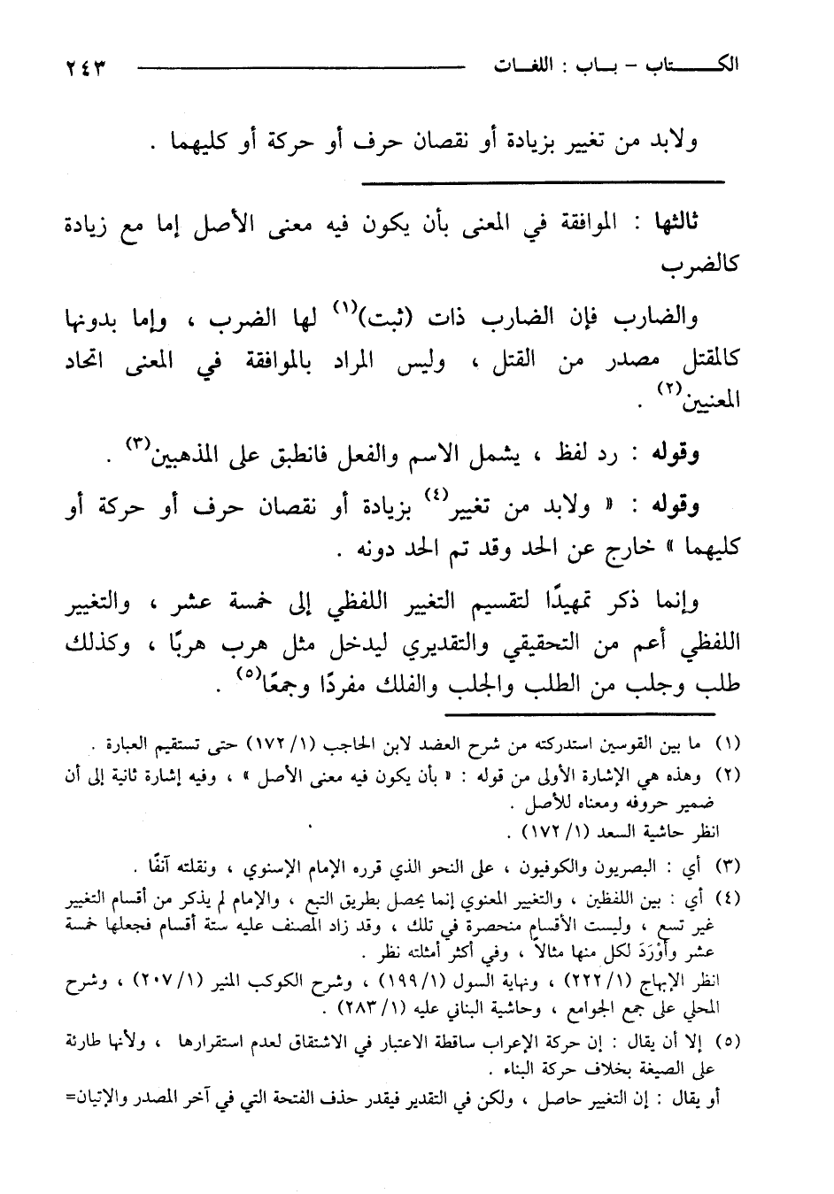وقوله: «ولابد من تغيير بزيادة أو نقصان حرف أو حركة أو كليهما» خارج عن الحد وقد تم الحد دونه.