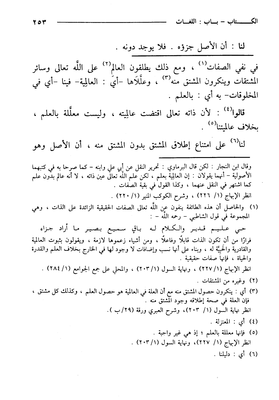 في نفي الصفات، ومع ذلك يطلقون العالم على الله تعالى وسائر المشتقان وينكرون المشتق منهن ,عللاها -أي: العالمية -فينا -أي في المخلوقات -به أي: بالعلم.
